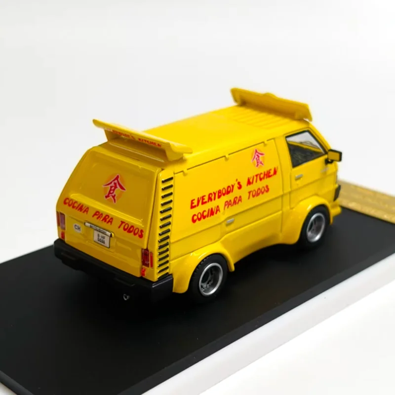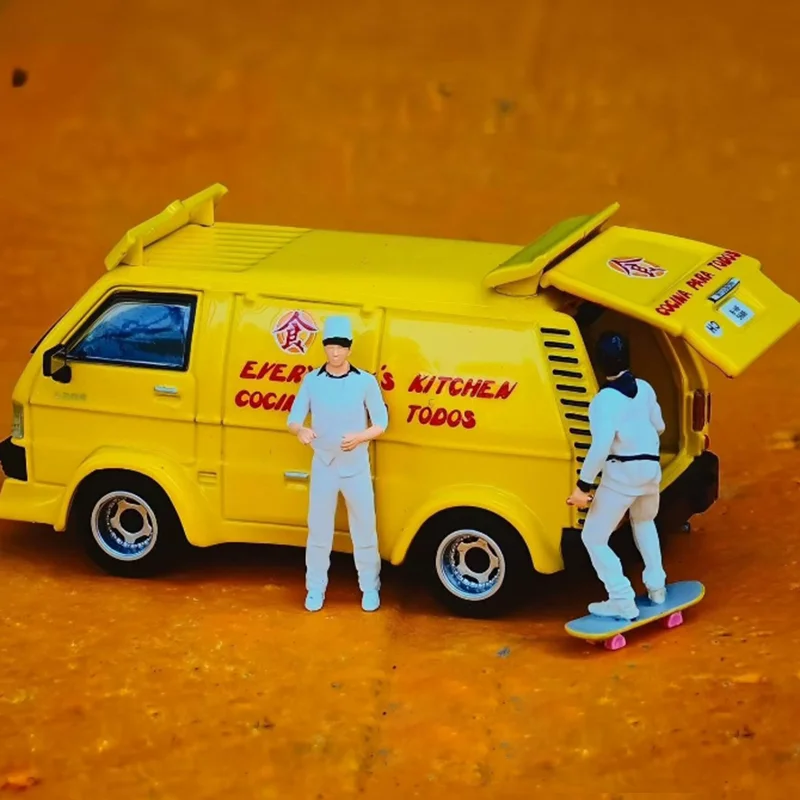 The MK MODEL 1:64 Scale Delica Food Truck is a vibrant diecast alloy car model, featuring a glossy yellow exterior with bold red graphics reading “ELETRICO E ATUAL COZINHA PARA TODOS.” Its design includes a flat front and large windows, characteristic of food trucks, complemented by a raised roof vent. This detailed model, constructed from alloys and plastics, is mounted on a contrasting black base with a golden plaque. Accompanying figures depict a chef in a white uniform and another in gray on a skateboard, enhancing the lively street food culture theme. Ideal for collection, display, or gifting.
