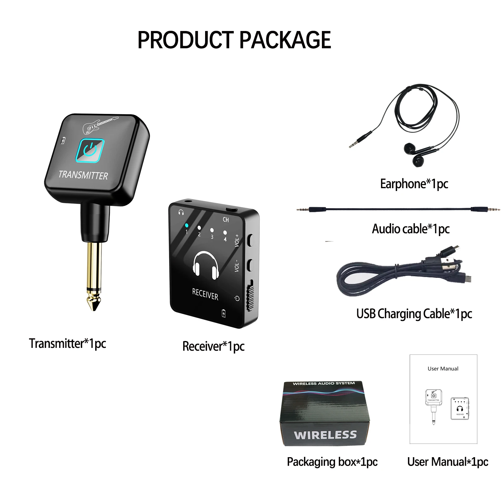 Experience the freedom of movement with the wireless in-ear monitoring system, featuring a compact black transmitter and receiver, designed for seamless audio performance. Operating on a 2.4GHz wireless transmission, it delivers low noise, low latency, and lossless sound quality across a transmission range of 20-40 meters. Enjoy uninterrupted sound with advanced frequency hopping technology that prevents interference from other devices. The rechargeable lithium battery offers up to 12 hours of use on a full charge, and the system can support up to 4 devices simultaneously, ensuring a clutter-free stage experience. Included are a transmitter, a receiver, and a charging cable.