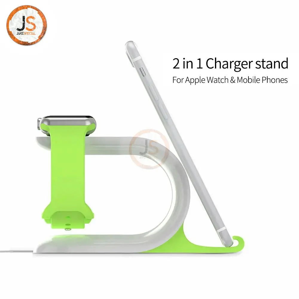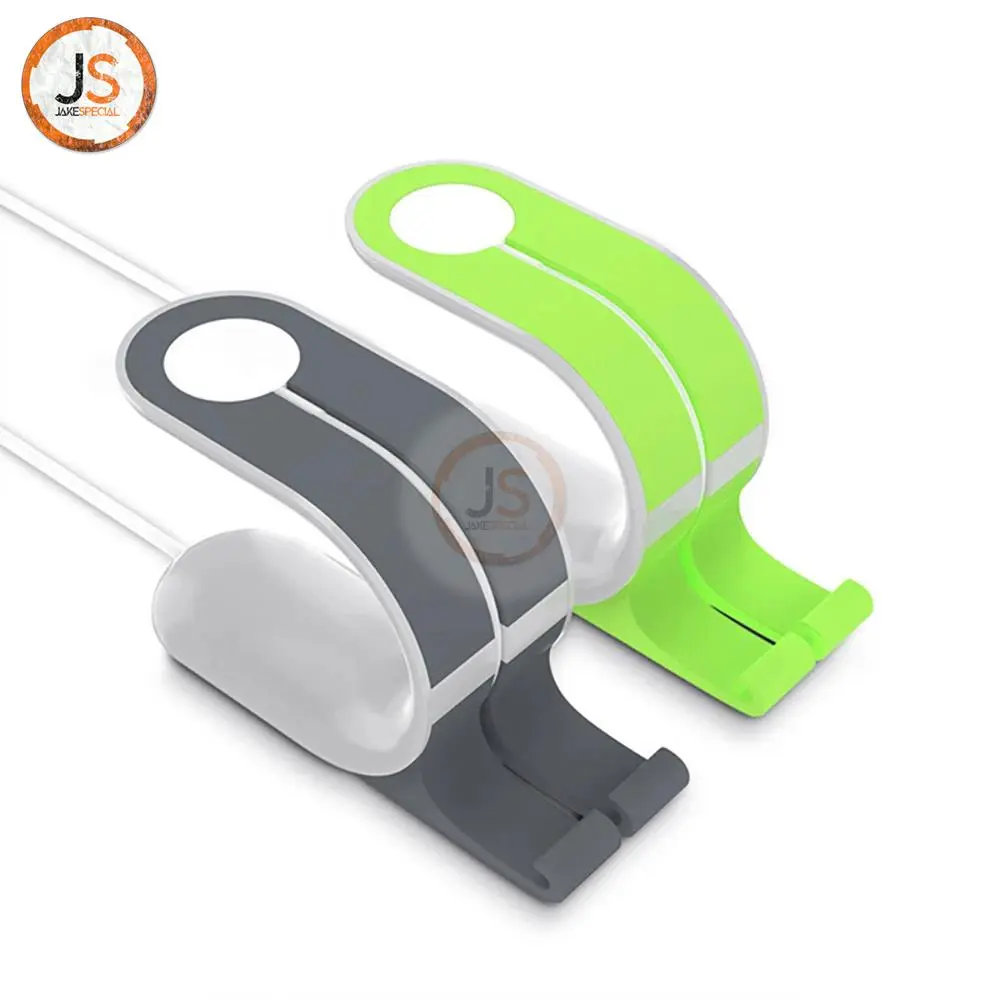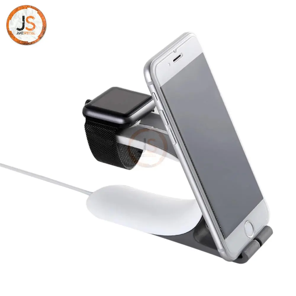 Elevate your charging experience with this Mobile Phone Watch Charging Stand, designed to enhance convenience and aesthetics. Embrace its sleek gray and white design, perfect for any decor. The upper gray section features a gentle curvature, promoting optimal viewing angles for your devices. Secure your smartphone in the designated slot while your smartwatch rests in its circular section, creating a harmonious charging solution. With a silicone anti-skid base, stability is guaranteed, ensuring your devices remain safe during charging. This robust stand is universally compatible, seamlessly accommodating both your iPhone and Huawei or Xiaomi devices. Visualize streamlining your charging routine with this stylish and functional addition to your home or office.