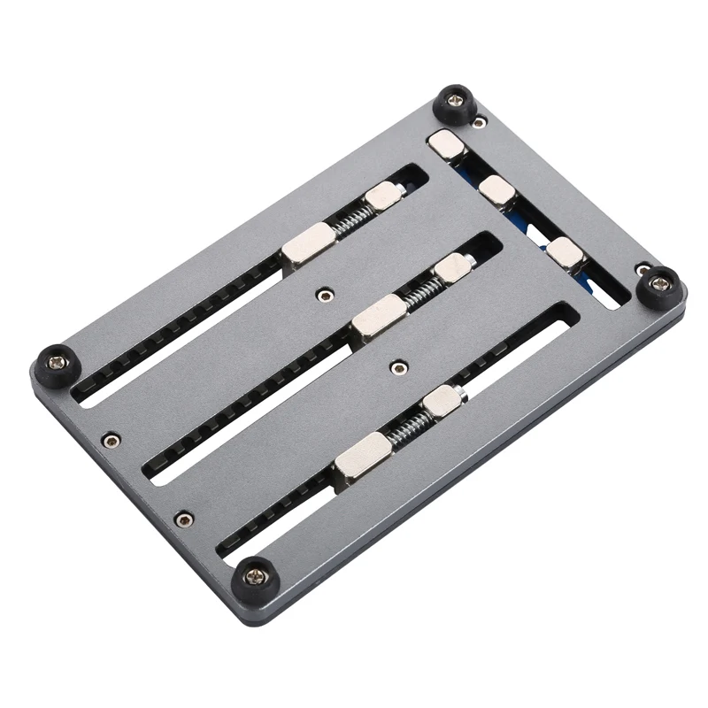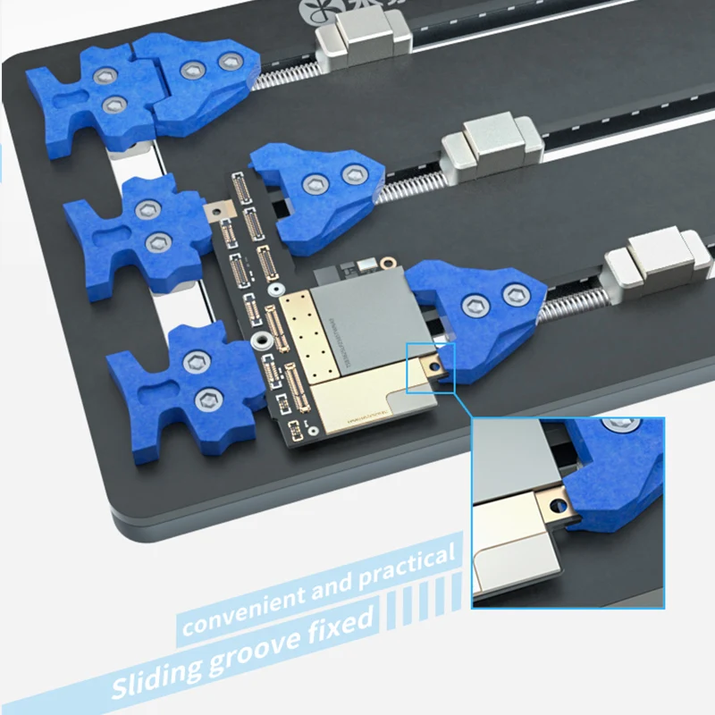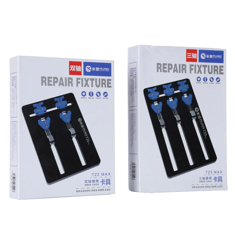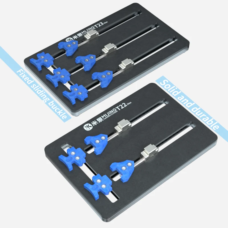 The Mijing T22MAX and T23MAX universal mobile phone motherboard repair fixtures offer a durable, high-temperature resistant, anti-static, and anti-deformation design for precise rework and soldering. Featuring a sleek, black rectangular base with integrated vertical grooves, bright blue heat-resistant clamp jaws, and metal threaded screws, these fixtures enable secure, rebound-free fixing of motherboards and ICs during repair. The rotary fixed design, supported by a rotary shaft, ensures efficient, stable clamping without rebound, while the sliding grooves and fixed buckles allow for accurate positioning. Ideal for professional PCB fixing in mobile phone repairs, these fixtures combine practicality with technical precision, making your repair process seamless and reliable.