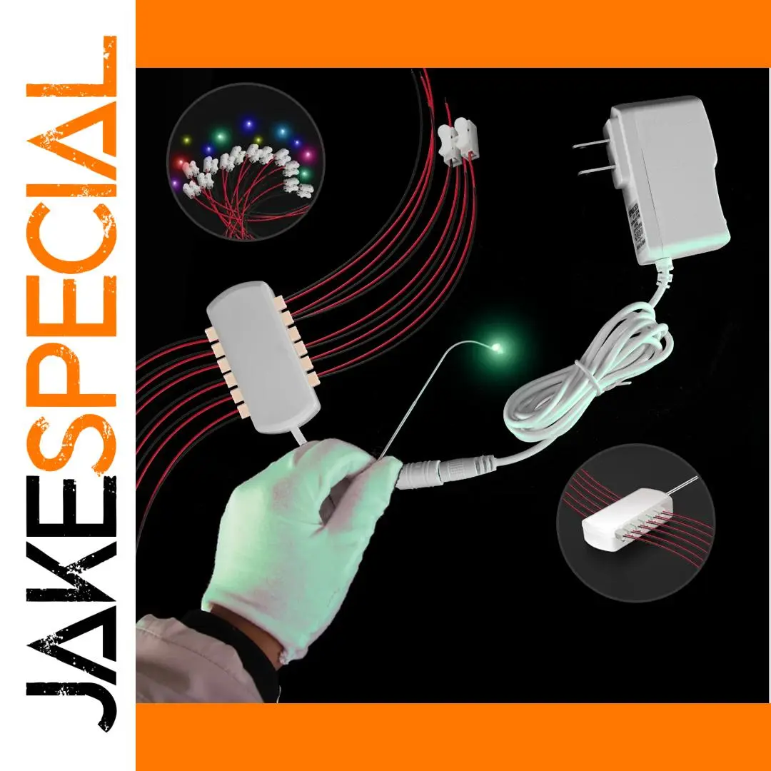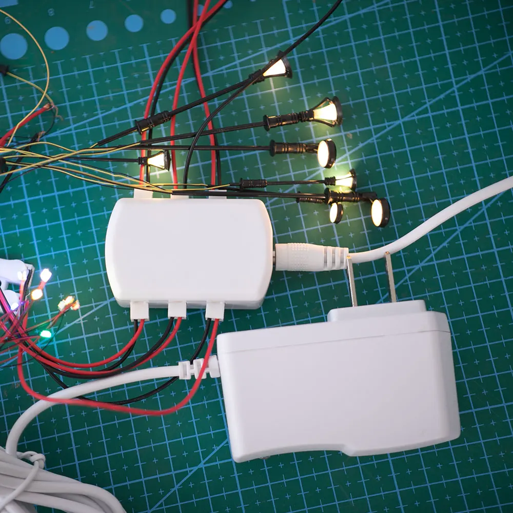 This versatile AC/DC power supply adapter features 12 ports with 30 light connections, suitable for model lighting, railway layouts, and diorama projects. Operating at 3V or 12V with a current of 20mA, it provides reliable power for various hobby applications. Crafted from durable rubber, the white adapter includes 12 male and linker plugs with wire lengths of 10 to 20 centimeters. Compatible with US, EU, UK, and AU outlets, it ensures broad regional use. The system supports high-luminance LEDs emitting 5000-6000 MCD, making it ideal for powering lamps, railway models, and cruise ship setups, combining practicality with durable design.