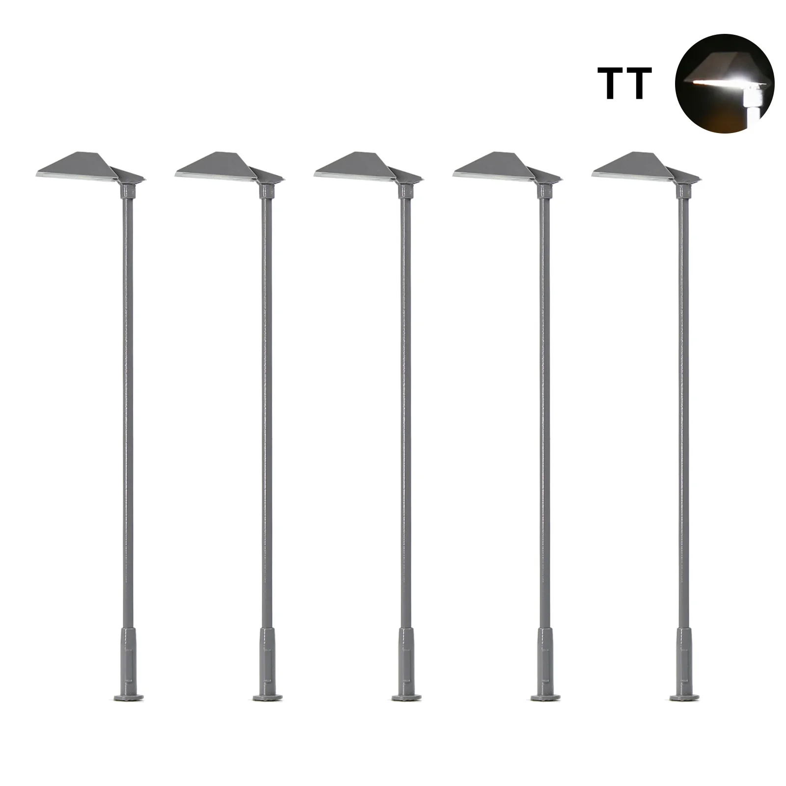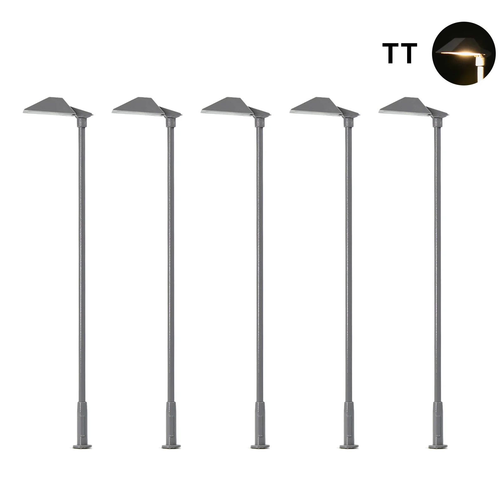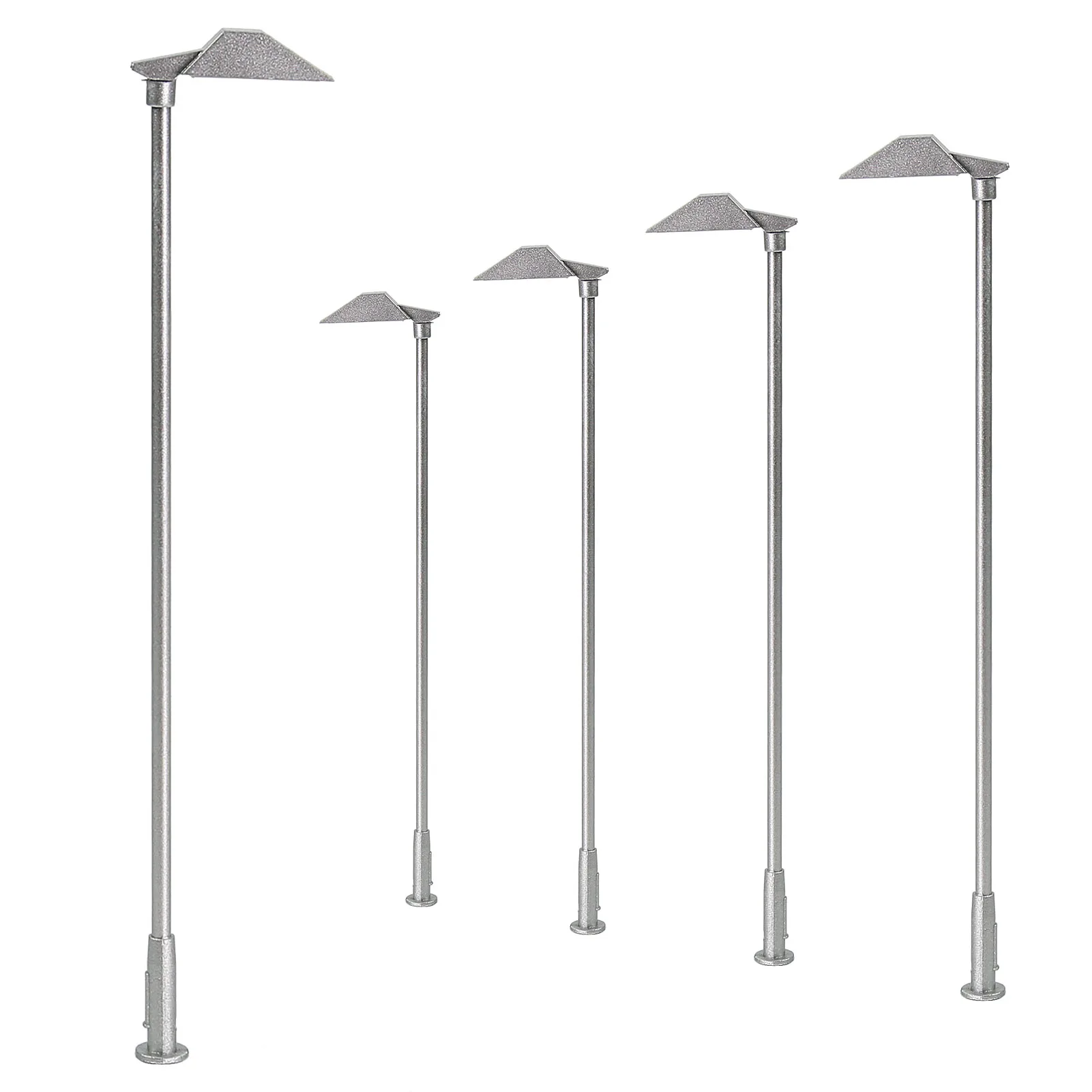 Elevate your model railway scene with this set of five LED street lamps, compatible with scales 1:87 (HO), 1:120 (TT), 1:160 (N), and 1:220 (Z). Crafted with sleek stainless steel posts in gray or silver finishes and topped with lightweight, angular plastic lampshades resembling truncated pyramids, these lamps feature bright white or warm white LEDs. Operating at 3V AC/DC with a 20mA current, each lamp includes a separate resistor for safe operation at voltages up to 18V. The set provides a modern, minimalist aesthetic, perfect for adding authentic detail and ambiance to your model landscape.
