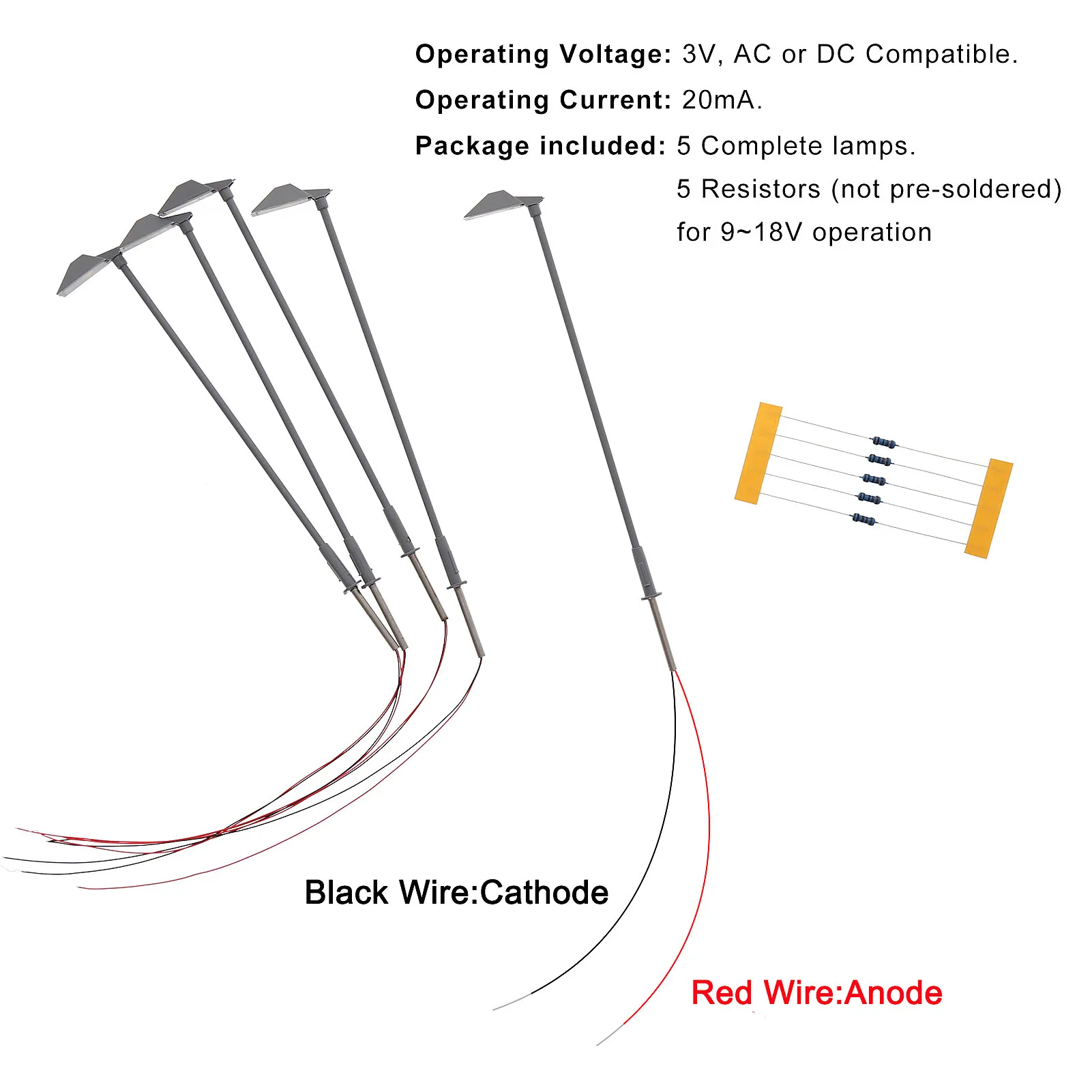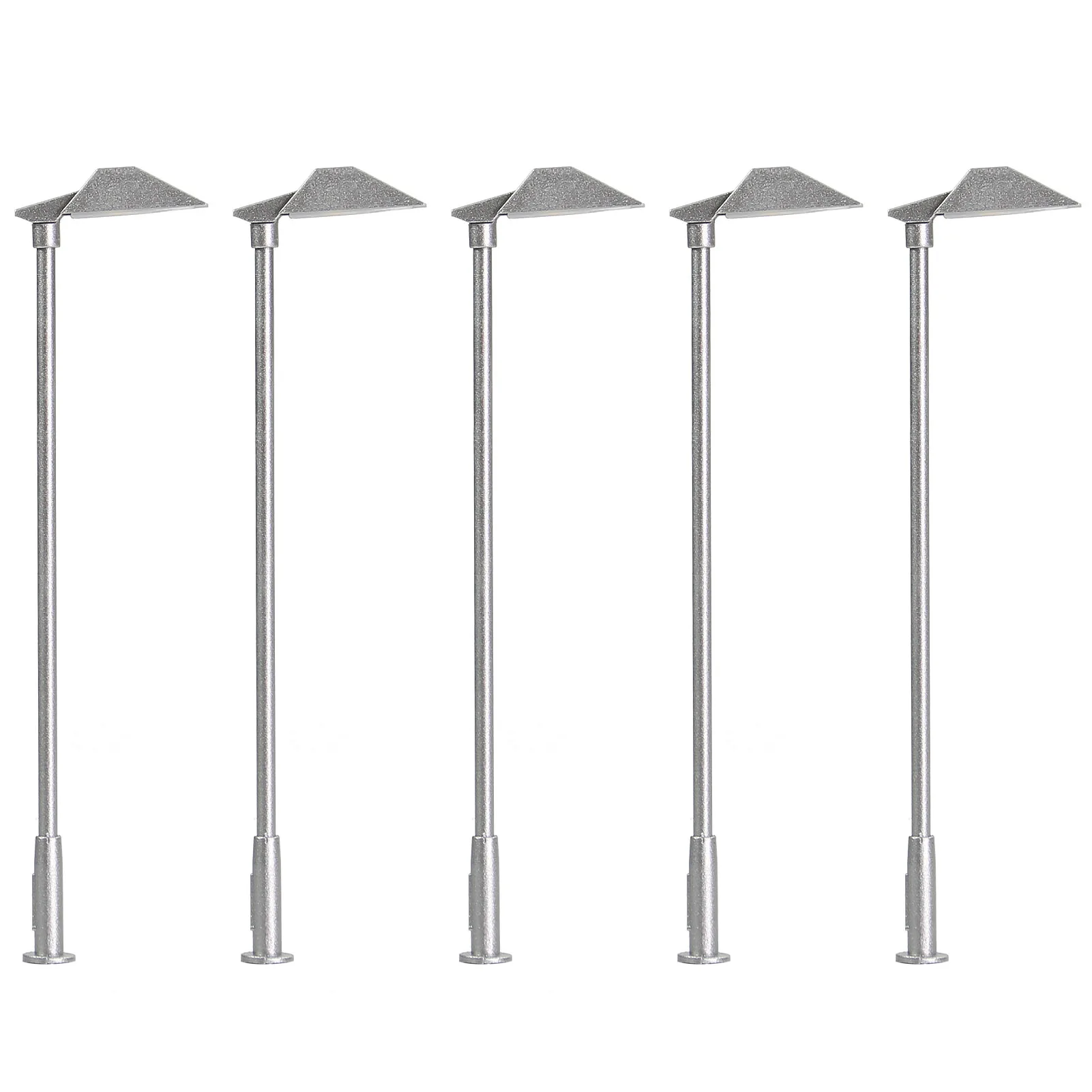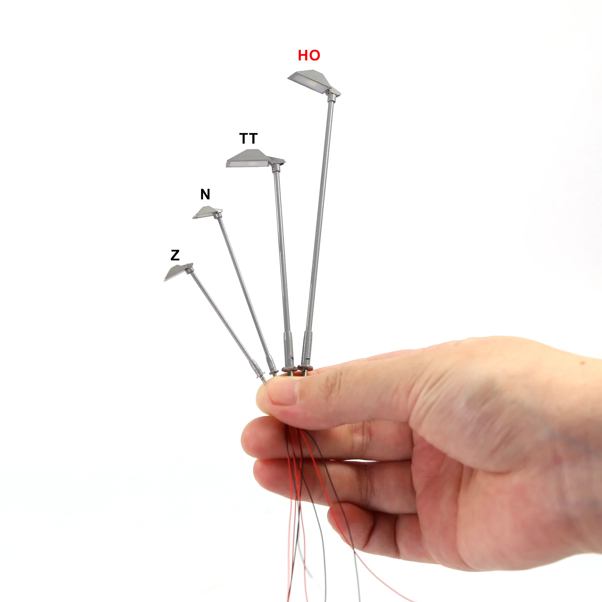 Elevate your model railway scene with this set of five LED street lamps, compatible with scales 1:87 (HO), 1:120 (TT), 1:160 (N), and 1:220 (Z). Crafted with sleek stainless steel posts in gray or silver finishes and topped with lightweight, angular plastic lampshades resembling truncated pyramids, these lamps feature bright white or warm white LEDs. Operating at 3V AC/DC with a 20mA current, each lamp includes a separate resistor for safe operation at voltages up to 18V. The set provides a modern, minimalist aesthetic, perfect for adding authentic detail and ambiance to your model landscape.