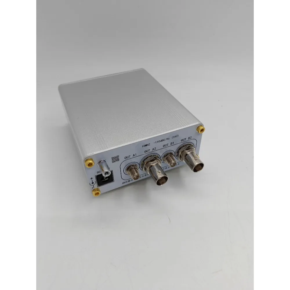 Experience the precision and reliability of this high-performance OCXO, designed for demanding electronic and communication systems. With a sleek, rectangular aluminum exterior in a modern silver finish, this device features a subtle brushed texture that enhances its sophisticated look. The cleanly finished edges and polished gold SMA and BNC connectors provide a luxurious contrast, emphasizing durable craftsmanship. Compact at approximately 110mm x 90mm x 45mm, it easily integrates into your existing setup. This OCXO ensures stable 10 MHz frequency output with minimal phase noise, ideal for applications requiring high stability and accuracy. Whether you're enhancing your system's timing or signal integrity, this device delivers professional-grade performance in a refined package.