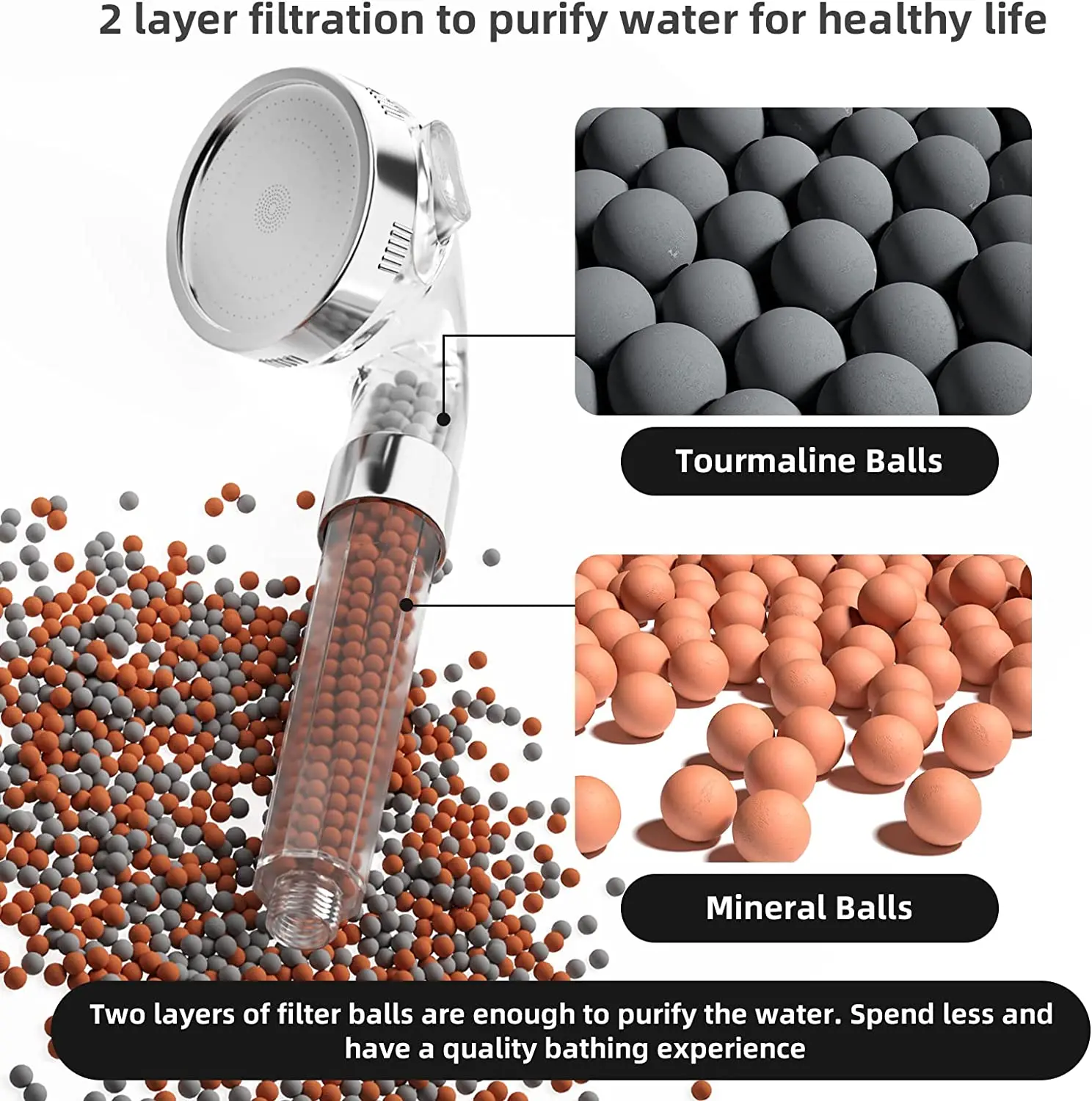 - Built-in mineral balls are designed to remove up to 99% of chlorine and impurities, purifying water, reducing chemical residuals, and maintaining optimal pH balance for healthier skin and hair.
