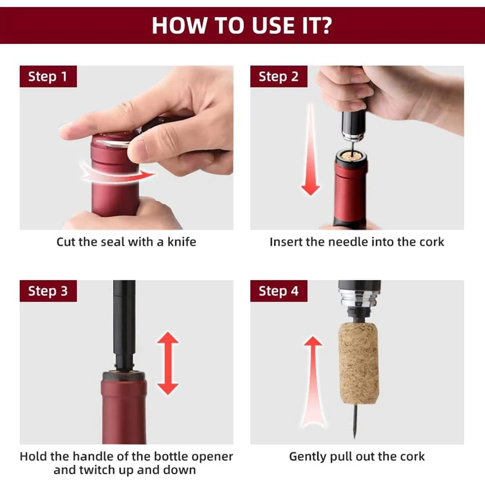 - Technical specifications: plastic (PP) construction, stainless steel pin corkscrew design, non-electronic, food contact safe, available in black or red colors, perfect for bars or home use.