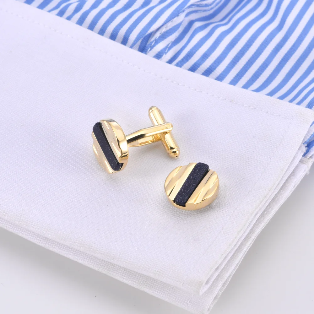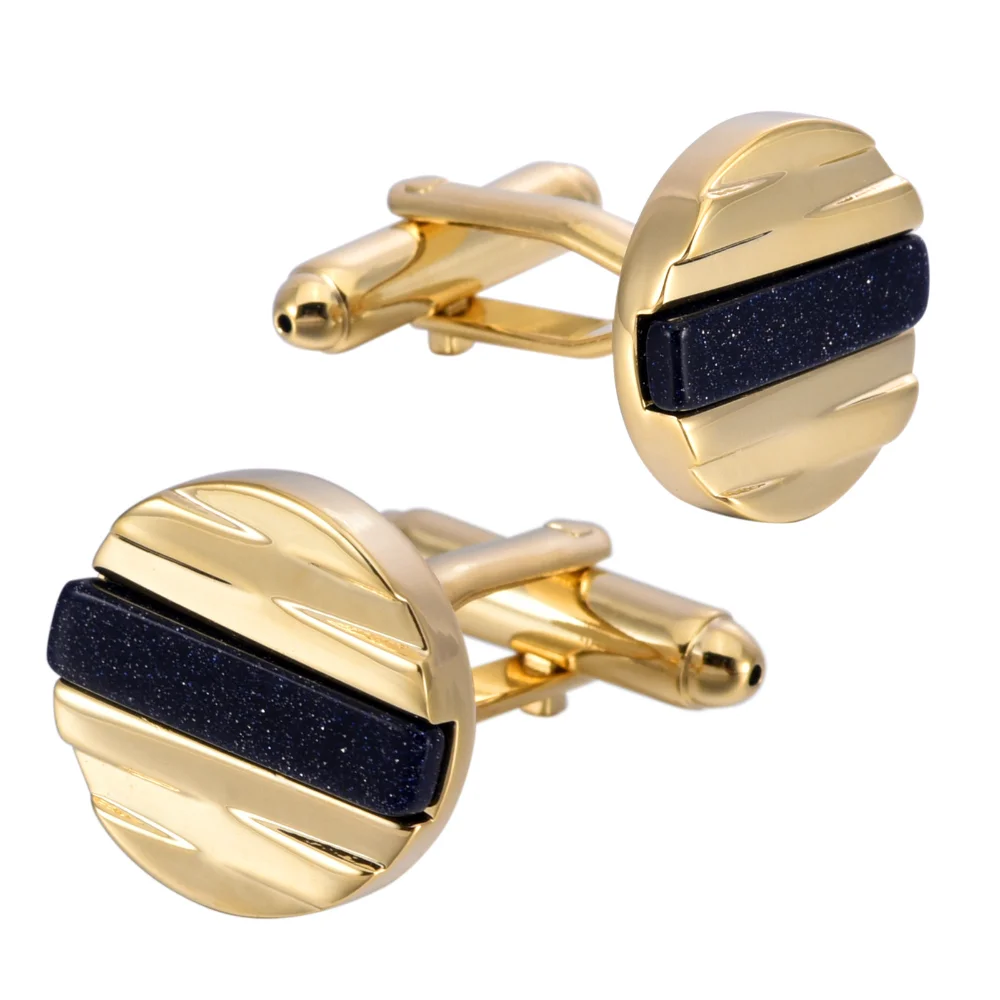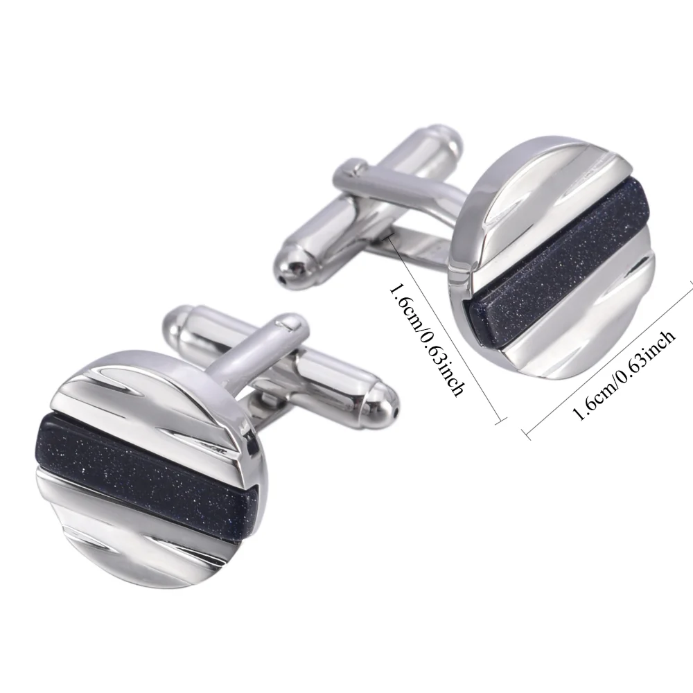 Elevate your formal and casual outfits with this set of stylish, unisex cufflinks crafted from durable alloy. Featuring a sophisticated multi-layer curved design complemented by striking striped patterns, these cufflinks add a touch of elegance and modern flair to your wardrobe. The eye-catching blue sandstone accents provide a textured contrast against the polished gold and silver finishes, perfect for making a subtle yet distinctive statement. Their versatile style suits various fashion tastes, from retro and military to minimalist and trendy looks. Designed for comfort and style, these cufflinks are easy to wear and durable enough for everyday use. Whether accessorizing a suit or DIY clothing projects, they guarantee a refined appearance for any occasion.
