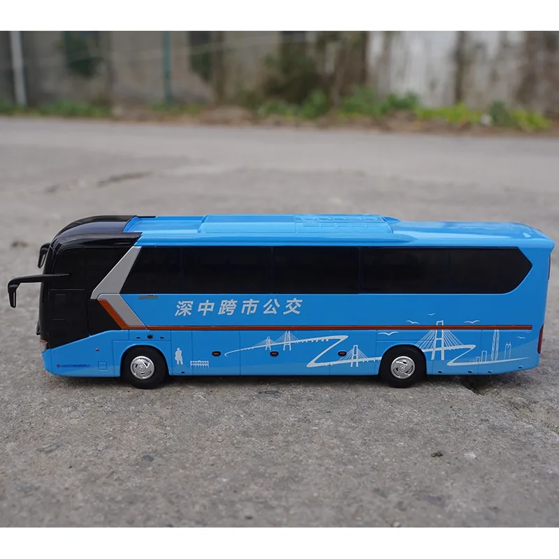 Discover the striking 1:38 scale diecast model of a modern city bus, measuring approximately 32 cm long, 6.5 cm wide, and 7.5 cm high. Crafted from durable alloy and ABS plastic, this collectible features a sleek, vibrant blue body accented with black details, white stylized graphics, and Chinese characters, embodying contemporary urban design. The realistic silver hubcaps and streamlined shape highlight precision and modernity, while the front middle door opens for added authenticity. Perfectly suited for display, this static ornament is designed for collectors aged 14 and above, offering a vibrant, detailed representation of a high-speed city transportation vehicle.