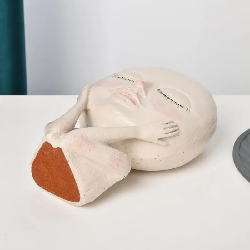 This modern resin tabletop vase, model T-100, features a minimalist female face design in a soothing beige or off-white matte finish. Measuring size M, it showcases closed eyelids with molded eyelashes, a gentle nose, and serene lips, accented with subtle blush cheeks. The smooth, rounded head tapers into a slender neck, with delicate arms framing the face for an artistic touch. Perfect for living rooms, balconies, bedrooms, or entryways, it functions as a stylish decorative ornament and flower holder for fresh, dried, or artificial blooms. Its versatile design effortlessly complements Nordic, INS, and retro decor themes, adding peaceful elegance to any space.