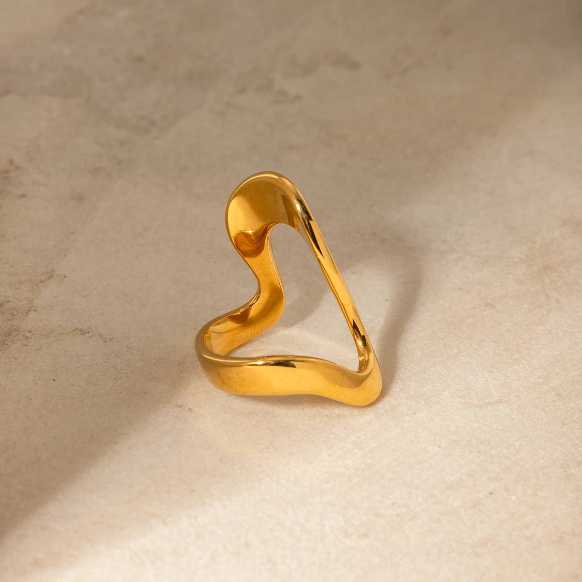 Experience the allure of this stunning modern geometric open ring crafted by Inlay. Made from durable stainless steel with a luxurious gold finish, it features flowing, abstract shapes with bold sweeping curves that evoke a contemporary artistic vibe. The ring's open-ended design emphasizes fluidity and movement, giving it a lightweight, comfortable feel for everyday wear. Its high-shine, reflective surface in both gold and silver tones enhances its sleek, modern look, making it a versatile accessory for any fashion style. Whether dressing up or down, this ring adds a bold statement to your ensemble. Its timeless design and high-quality materials ensure it remains a cherished piece in your jewelry collection, perfect for expressing your sophisticated sense of style.