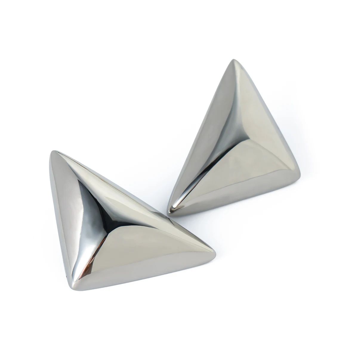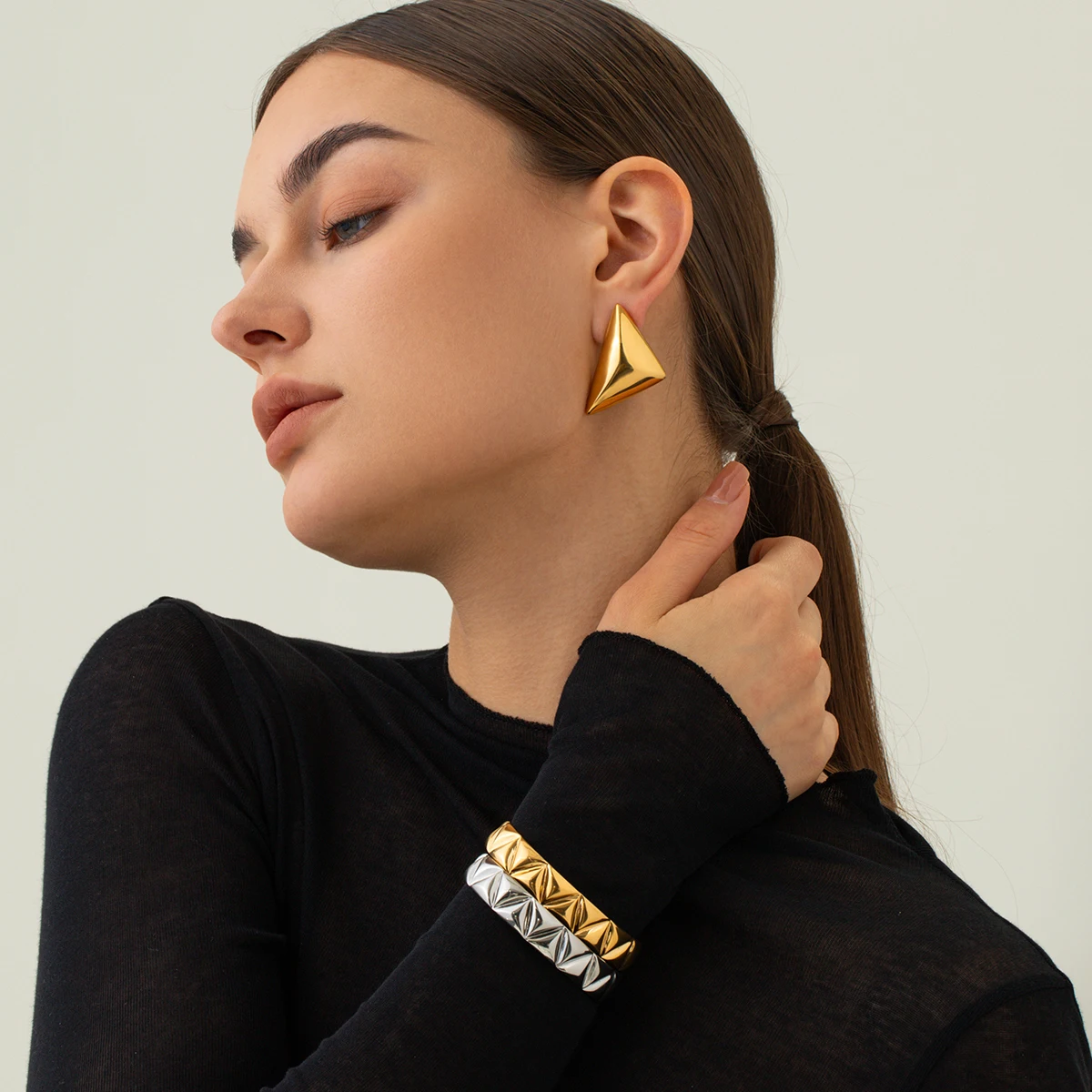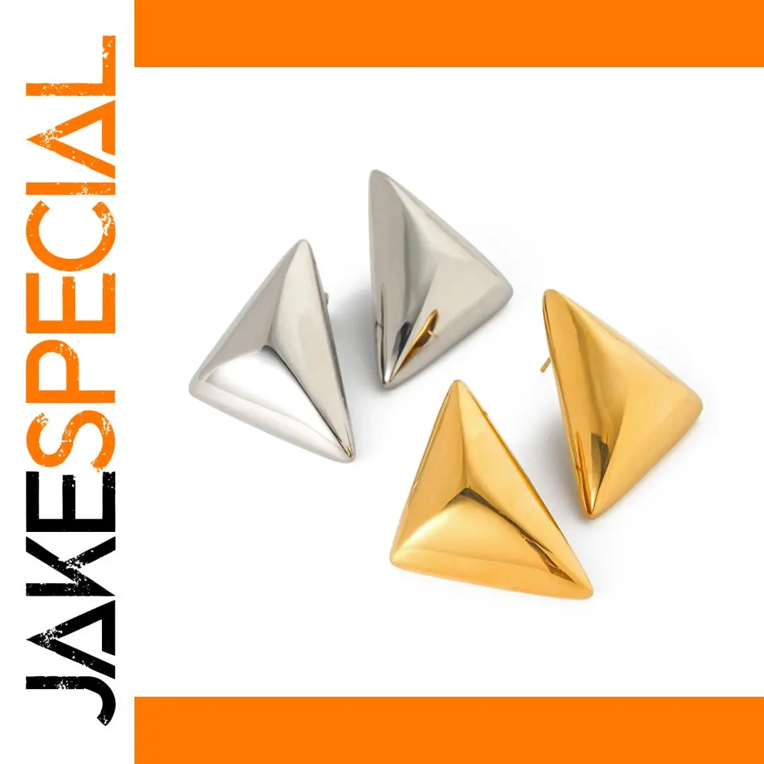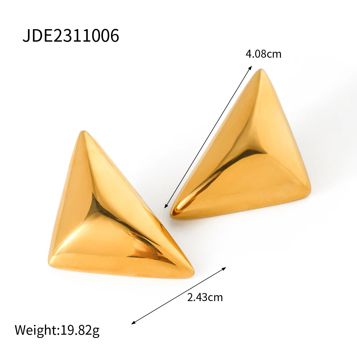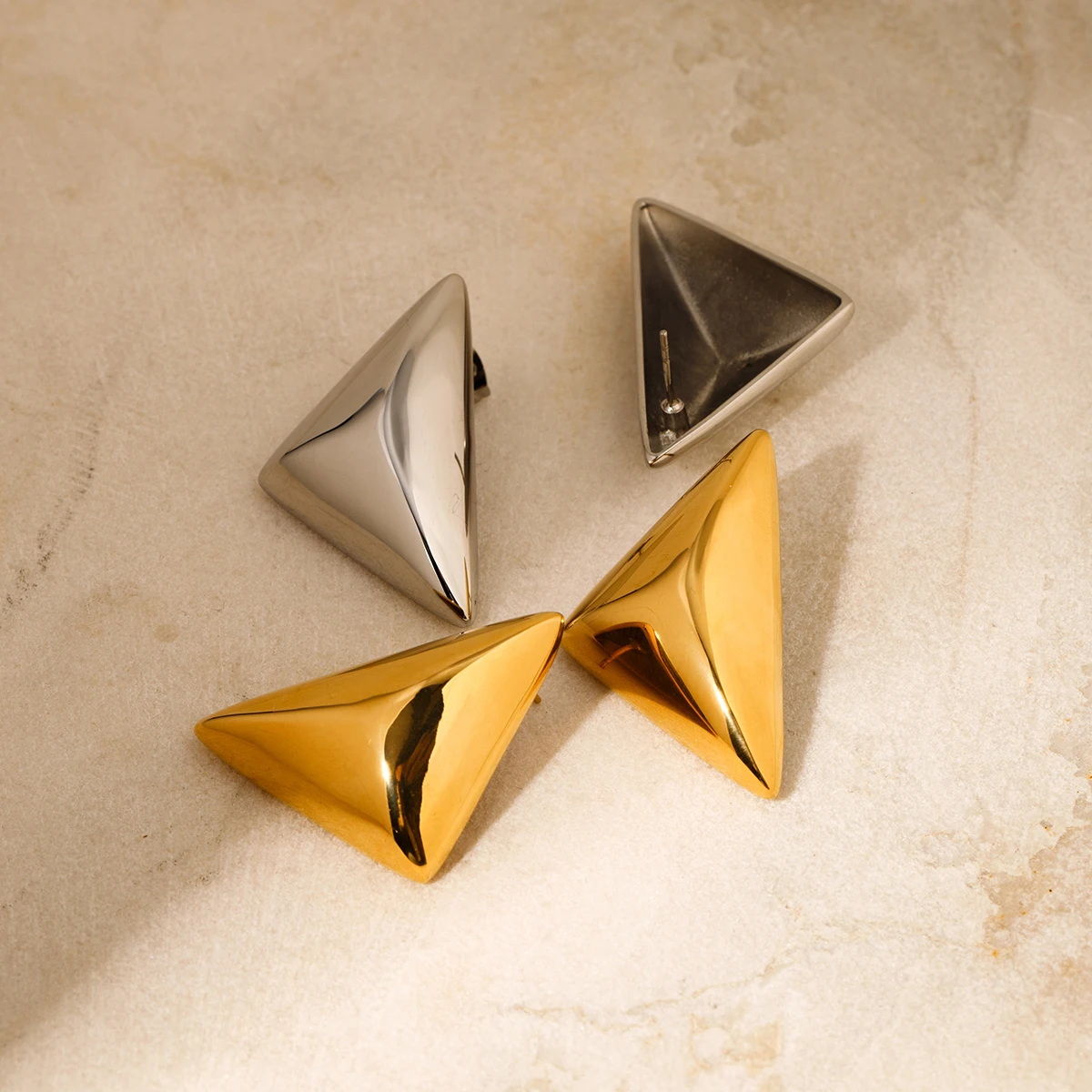 Elevate your style with these stainless steel geometric earrings (model JDE2311006 and JDE2311006-S), featuring a modern, minimalist design with hollow, rounded triangular shapes and a three-dimensional open pyramid structure. Crafted from high-quality, rust-proof stainless steel, they boast a polished, reflective surface available in sleek silver and glossy gold finishes. These lightweight earrings combine sharp angles with soft curves, creating a contemporary aesthetic perfect for daily wear or special occasions. Secure push-back fastenings shaped as triangles ensure easy handling and comfort for all-day wear. Effortlessly chic and versatile, they are a perfect addition to any fashion-forward wardrobe.