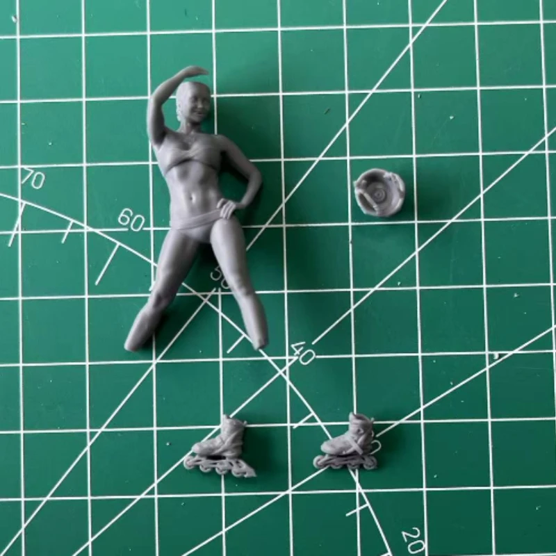 Discover the detailed 1/35 scale resin model kit of a modern girl, featuring unassembled, unpainted gray components made from environmentally friendly resin. Dressed in a textured military helmet with straps and chin guard, she has a youthful hairstyle with hair beneath the helmet, styled in a bun or ponytail. Her fitted tank top exposes her shoulders and midriff, paired with form-fitting shorts accentuating her hips and legs. She stands in a relaxed, dynamic pose on inline roller skates with visible laces, straps, and wheels, perfect for micro scene or diorama projects. Suitable for ages 14+, it requires assembly, painting, and coating, with resin flexible when softened in hot water.