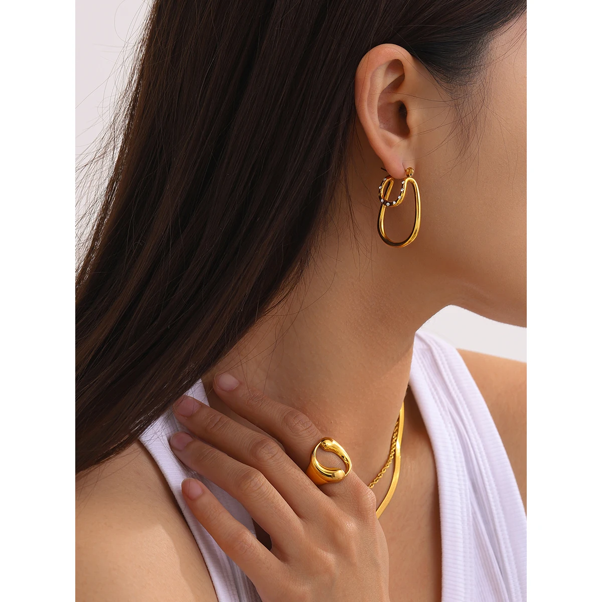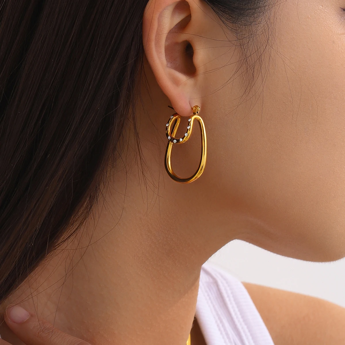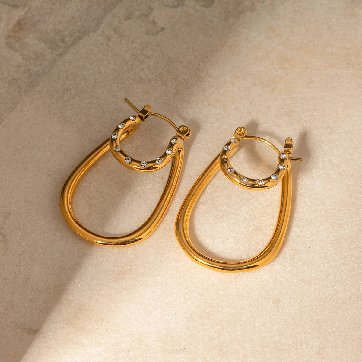 Elevate your style with these stunning stainless steel earrings, featuring a contemporary geometric design that combines elegance and modernity. Crafted from high-quality stainless steel with a durable PVD gold finish, these earrings boast a vibrant, shiny appearance that resists fading and scratches over time. The design showcases smooth, rounded teardrop shapes complemented by a delicate outer ring adorned with tiny cubic zirconia stones, adding subtle sparkle to your look. Lightweight at approximately 15 grams, they offer comfortable, all-day wear suitable for any occasion. Whether casual or dressy, these chic studs are perfect for women who appreciate fashion-forward jewelry with lasting quality and eye-catching beauty.