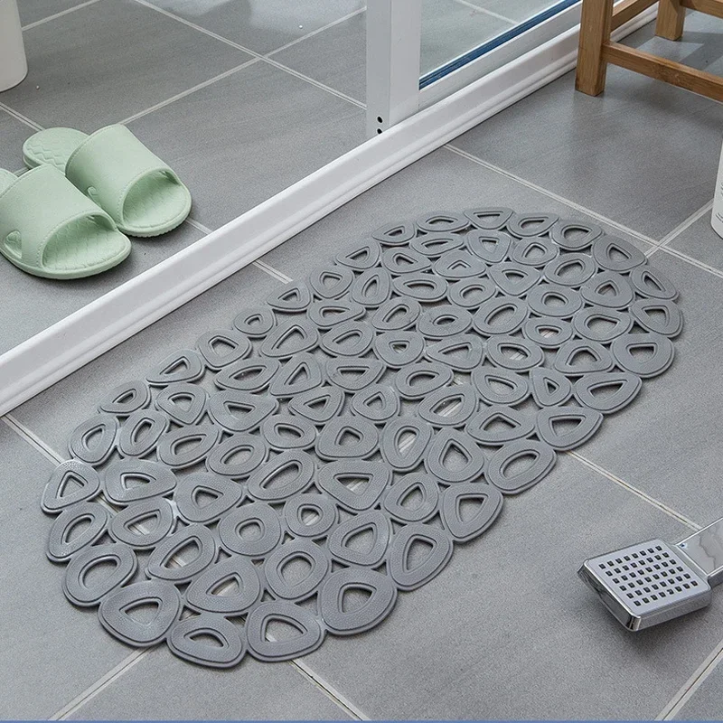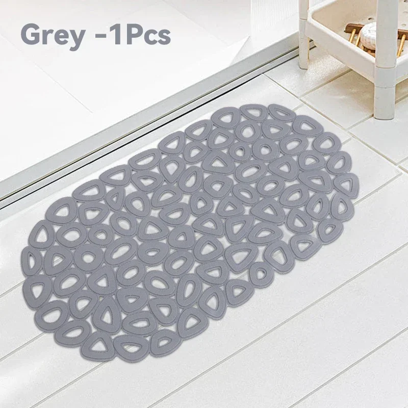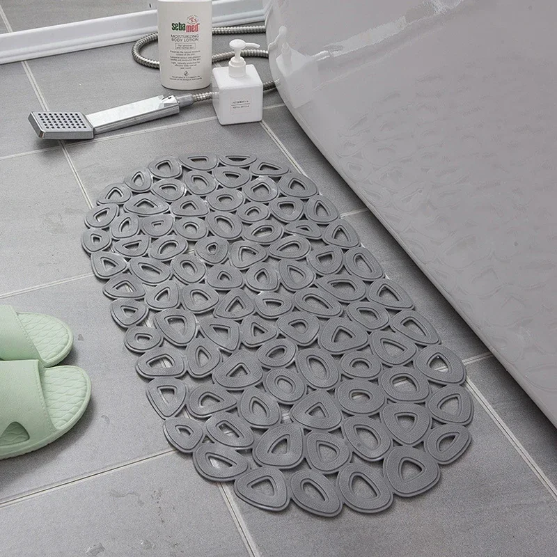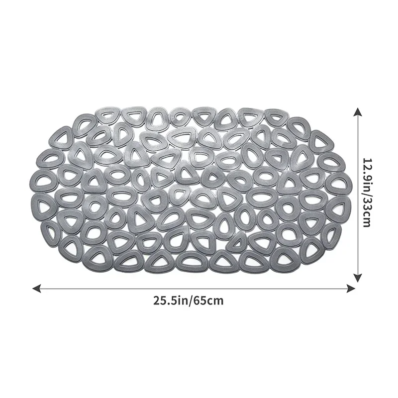 Experience safety and elegance with this this modern grey bathroom mat, measuring 65x33cm. Crafted from durable PVC, it features a sleek geometric pattern of elliptical holes for quick water drainage, keeping your bathroom dry and safe. The textured surface offers a comforting massage effect, making your daily routines more enjoyable. Equipped with powerful suction cups on the underside, this mat secures firmly to the floor, preventing slips when wet. Its eco-friendly, waterproof design seamlessly combines practicality and style, enhancing any contemporary bathroom decor. The muted grey tone complements various interiors and provides a sophisticated, minimalist aesthetic. Embrace a safer and more comfortable bathroom environment with this high-quality, modern mat that blends functionality with visual appeal.
