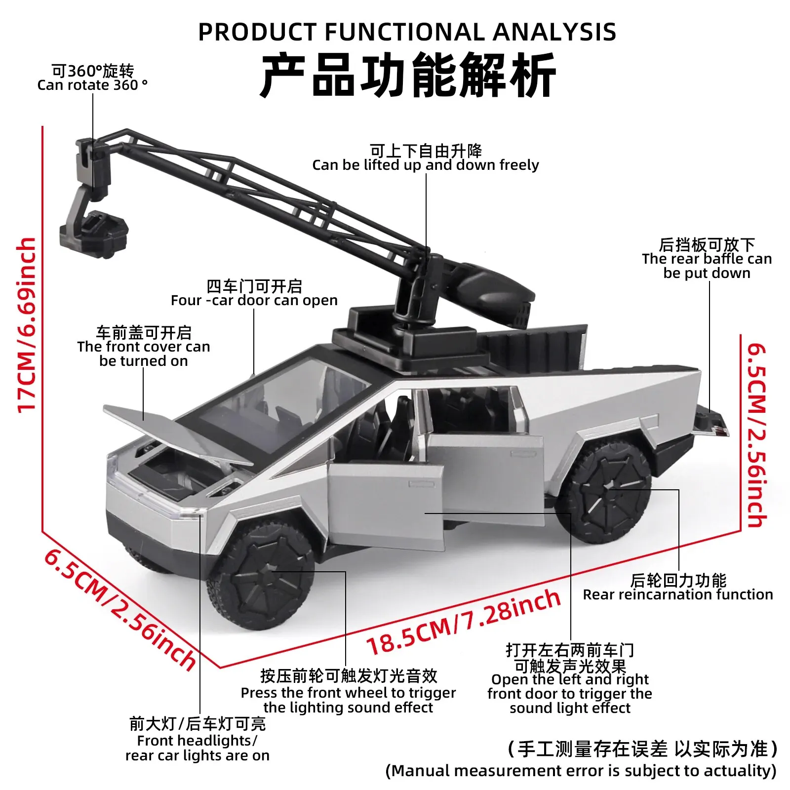 Imagine bringing home this stunning 1:32 scale diecast metal toy truck, finely crafted with realistic details that elevate your collection or play experience. The sleek, metallic silver finish showcases a contemporary, industrial design, perfect for enthusiasts and collectors alike. Its smooth surfaces, minimalistic styling, and angular features evoke a sense of rugged modernity. The truck is equipped with sound and light functions, adding immersive playability. Crafted from durable metal with carefully integrated electronics, it offers a realistic feel and vibrant visual appeal. Suitable for indoor display or active use, this toy elevates your collection and sparks imagination for hours.