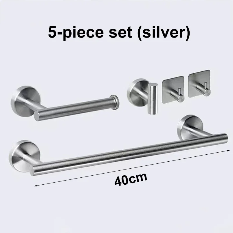 Transform your space with this modern bathroom hardware set crafted from high-quality 304 stainless steel, ensuring durability and rustproof performance. It features a sleek round towel hook, a generous towel rail, a practical bar rack, a stylish round stainless steel shelf, a tissue holder, and a toilet paper holder—perfect for organizing towels, clothes, and essentials in bathrooms, kitchens, or bedrooms. Available in elegant silver and matte black finishes, all pieces boast a brushed surface finish for a refined look. Designed for wall mounting with screw installation, this minimalist set combines functionality with contemporary style, elevating your space with subtle geometric shapes and smooth lines for lasting aesthetic appeal.