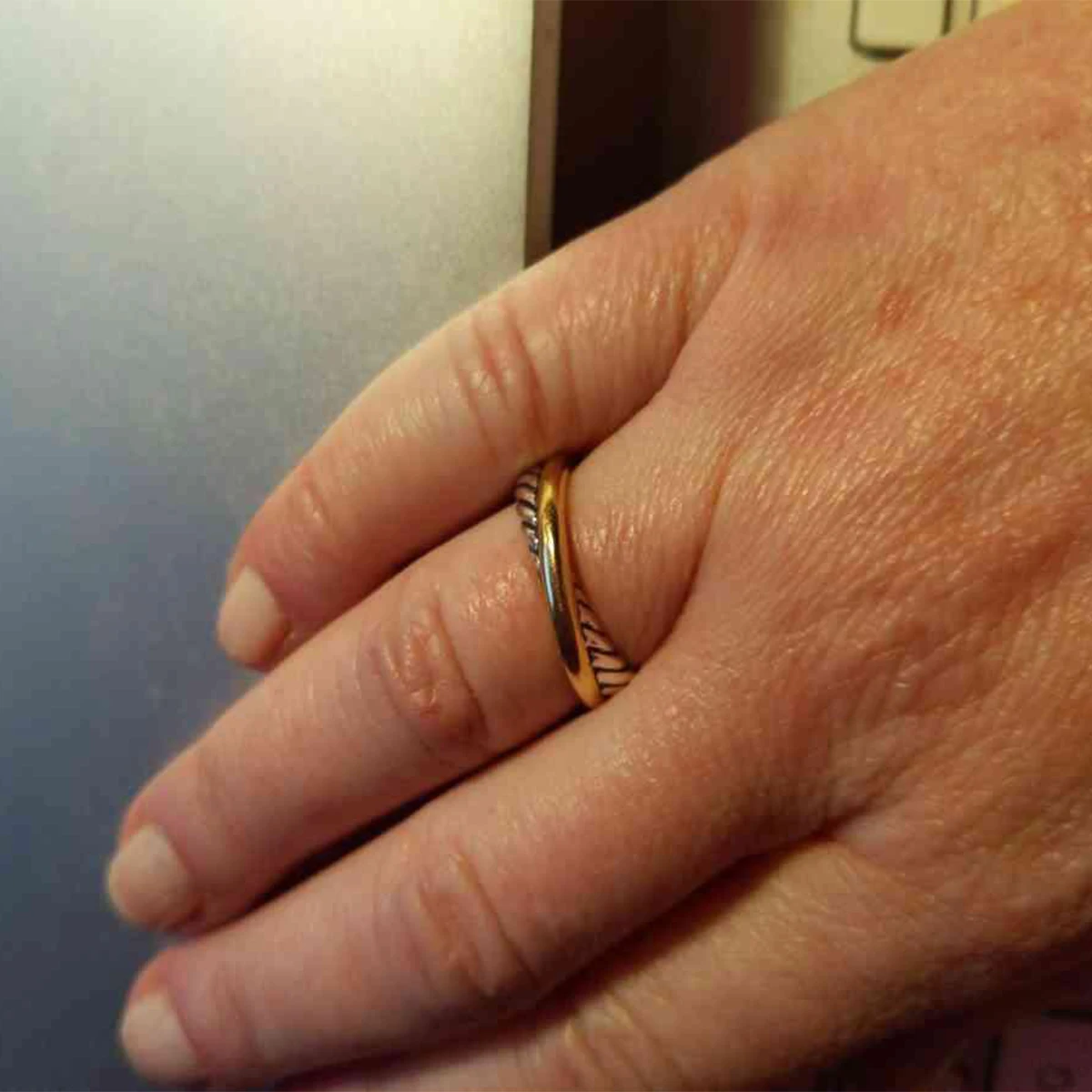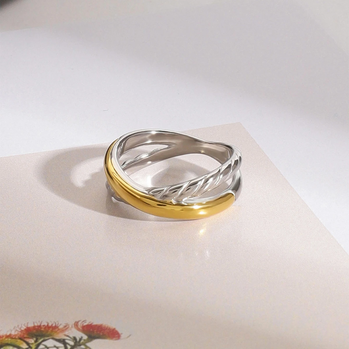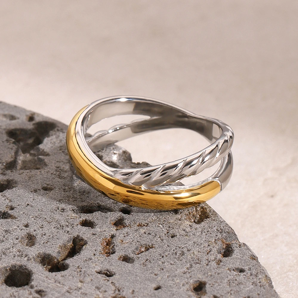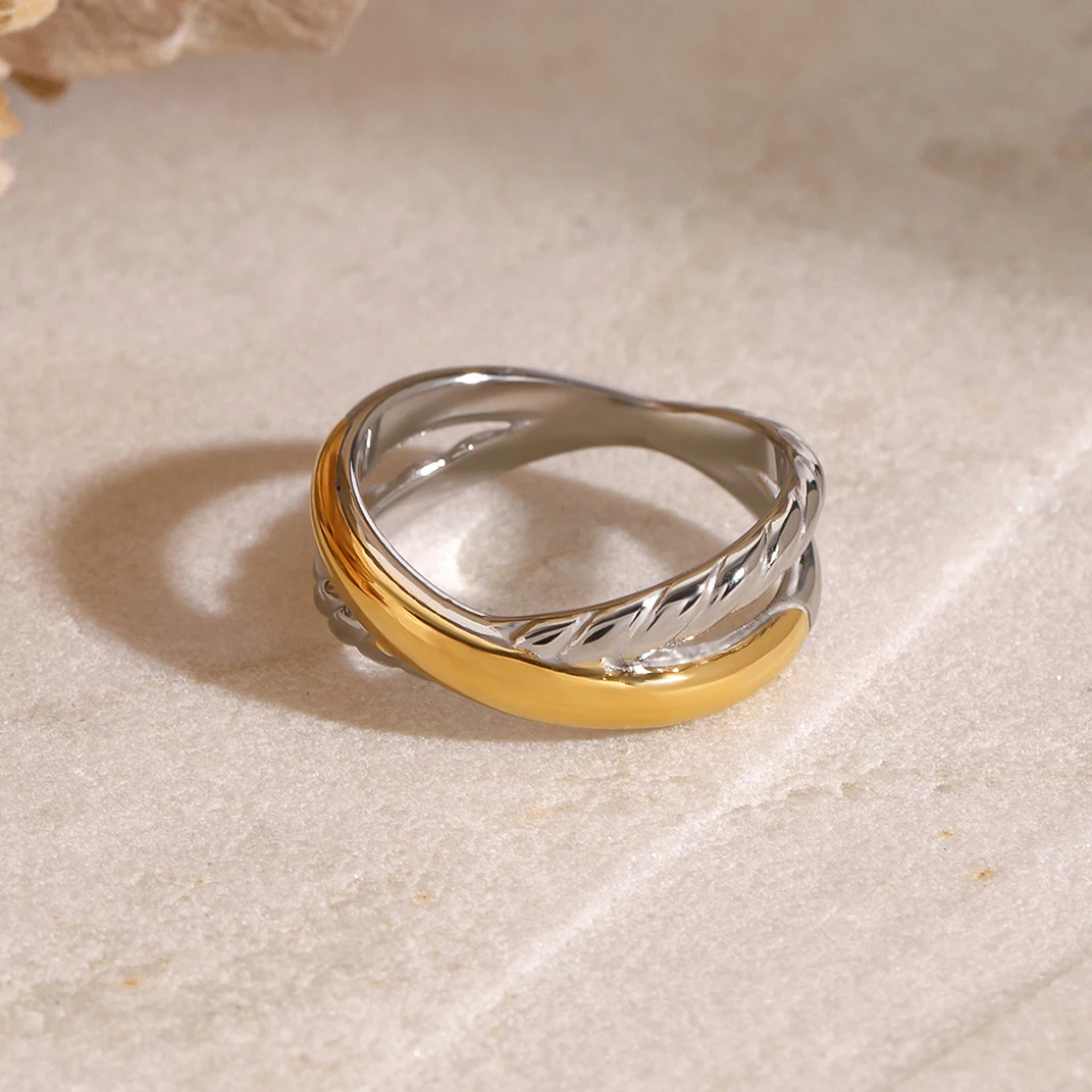 Discover the sophisticated charm of this this modern gold and silver stackable ring, designed to elevate your style effortlessly. Crafted from durable stainless steel with a PVD gold finish, this ring combines a sleek 2mm or 3mm wide smooth thread line with a modern geometric shape, offering a minimalist yet trendy aesthetic. Its polished surface gleams with long-lasting color, scratch resistance, and waterproof qualities, making it perfect for daily wear or special occasions like engagements. The contrasting silver-tone twisted band adds visual interest while maintaining a clean, elegant look. Whether you’re stacking it with other rings or wearing it alone, this accessory blends fashion and durability seamlessly. Its light weight of 15 grams ensures comfort, while its universal size 7 makes it ideal for many occasions. This jewelry piece embodies contemporary chic with durable craftsmanship.