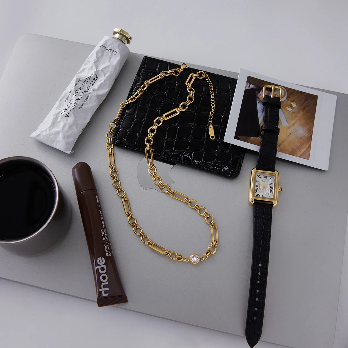 - The chain’s design includes round and rectangular links, creating a modern geometric pattern that enhances its stylish, contemporary aesthetic suitable for various fashion contexts.