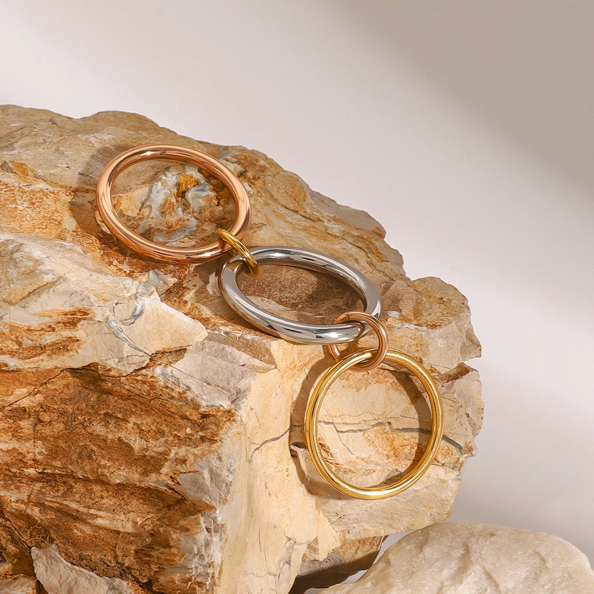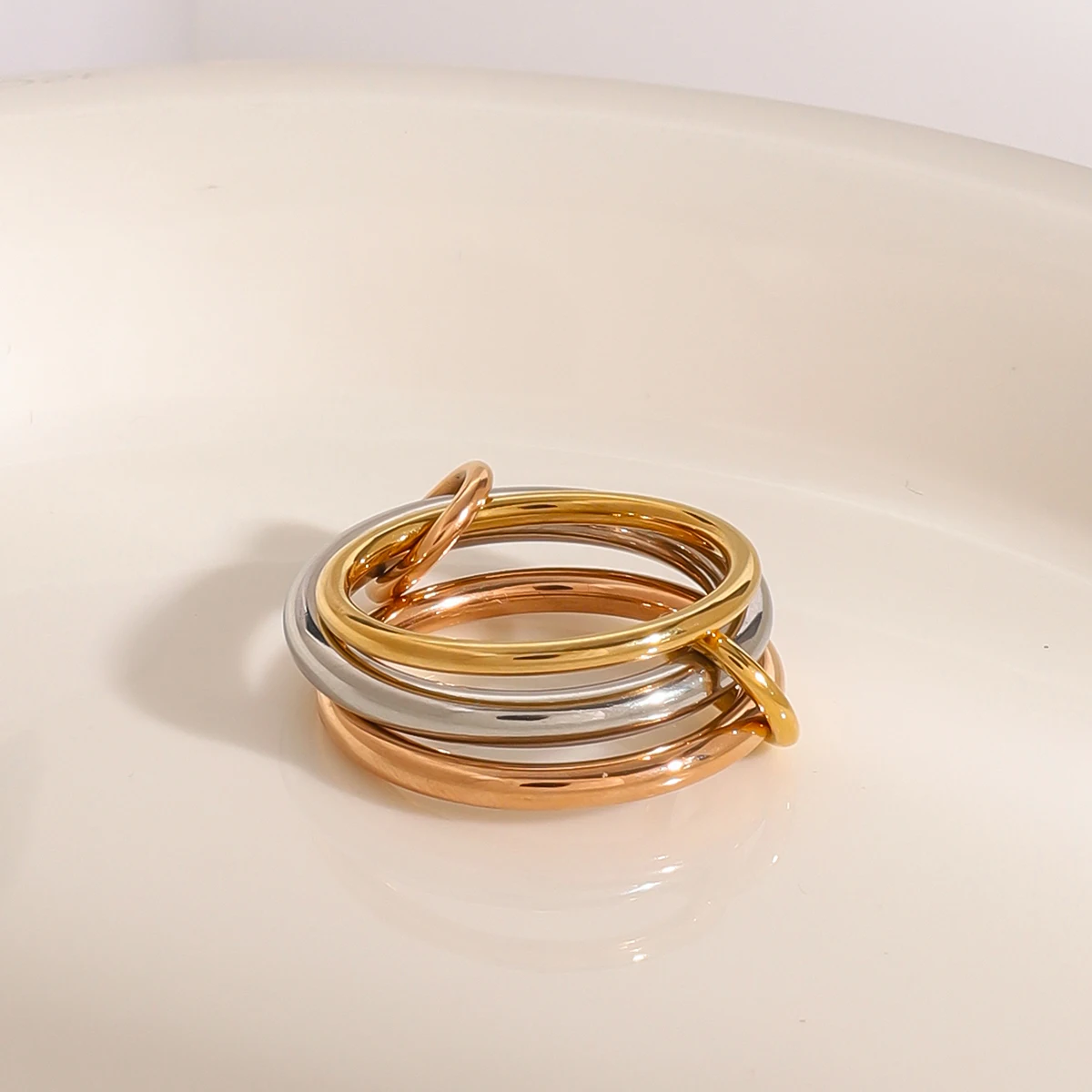 This stainless steel interlocking ring features a sleek, modern multi-layered design with a two-tone finish of gold PVD and silver tones. Weighing approximately 15 grams, it comes in size 8 with surface widths of 2mm, 3mm, or 4mm, showcasing round shape patterns for a refined look. Crafted for durability, it is waterproof, nickel-free, lead-free, and cadmium-free, ensuring safe wear. Its fashionable style makes it perfect for parties, combining contemporary aesthetics with functional features like fitness, sleep, mood, and period tracking, along with alarm clock, message, and call reminders. Elevate your accessories with this elegant, multi-functional jewelry piece.