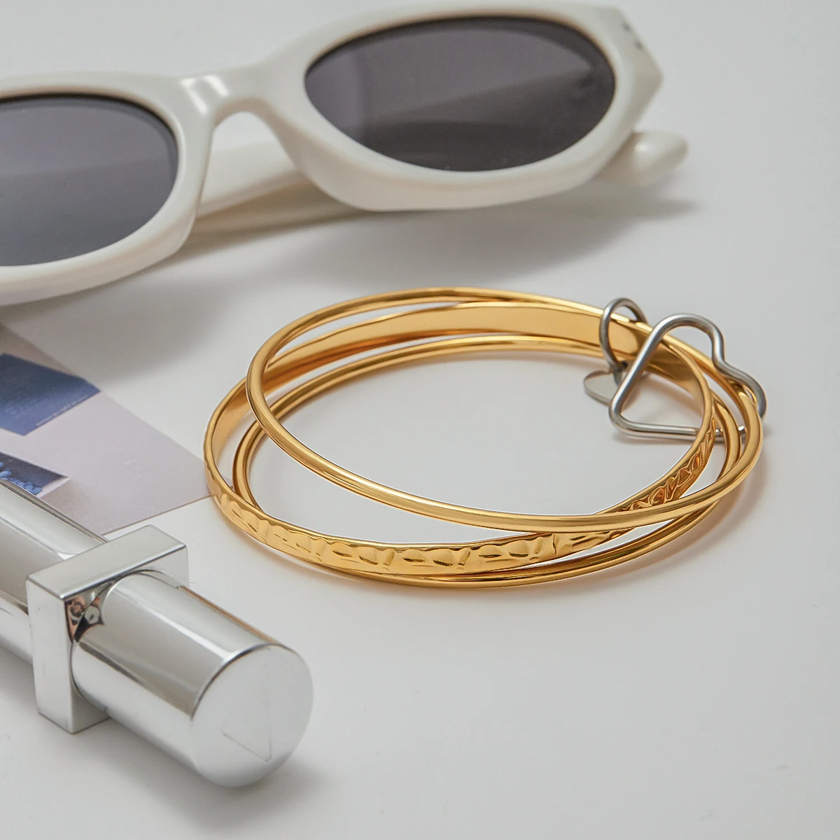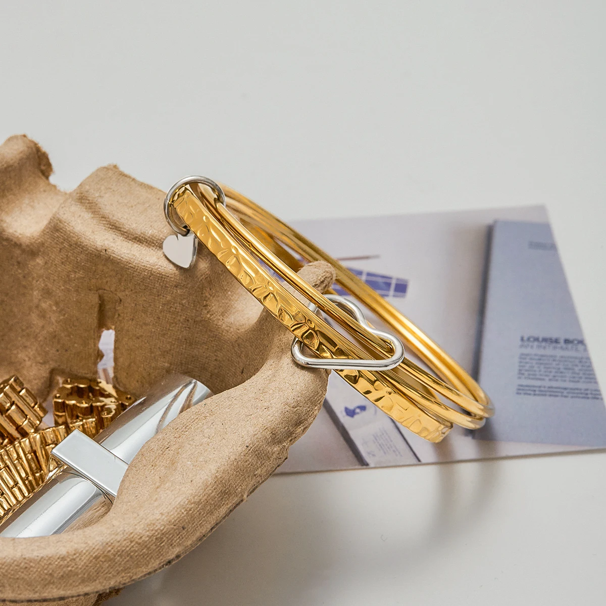 Imagine adding a touch of sophistication to your everyday style with this set of modern stainless steel bangles. Designed for women who appreciate sleek, minimalist aesthetics, these multi-layered bangles feature a contemporary blend of gold and silver tones. The set includes two gold-colored bangles with subtle textured details and one silver-tone bangle with a charming hollow heart-shaped pattern. Crafted from durable, waterproof stainless steel, they boast a polished, shiny surface that resists weather conditions and maintains its brilliance over time. The bangles are lightweight, round, and slip effortlessly onto your wrist without any clasps, ensuring a comfortable fit. Perfect for both casual and formal occasions, this jewelry set exudes timeless elegance with a modern twist.