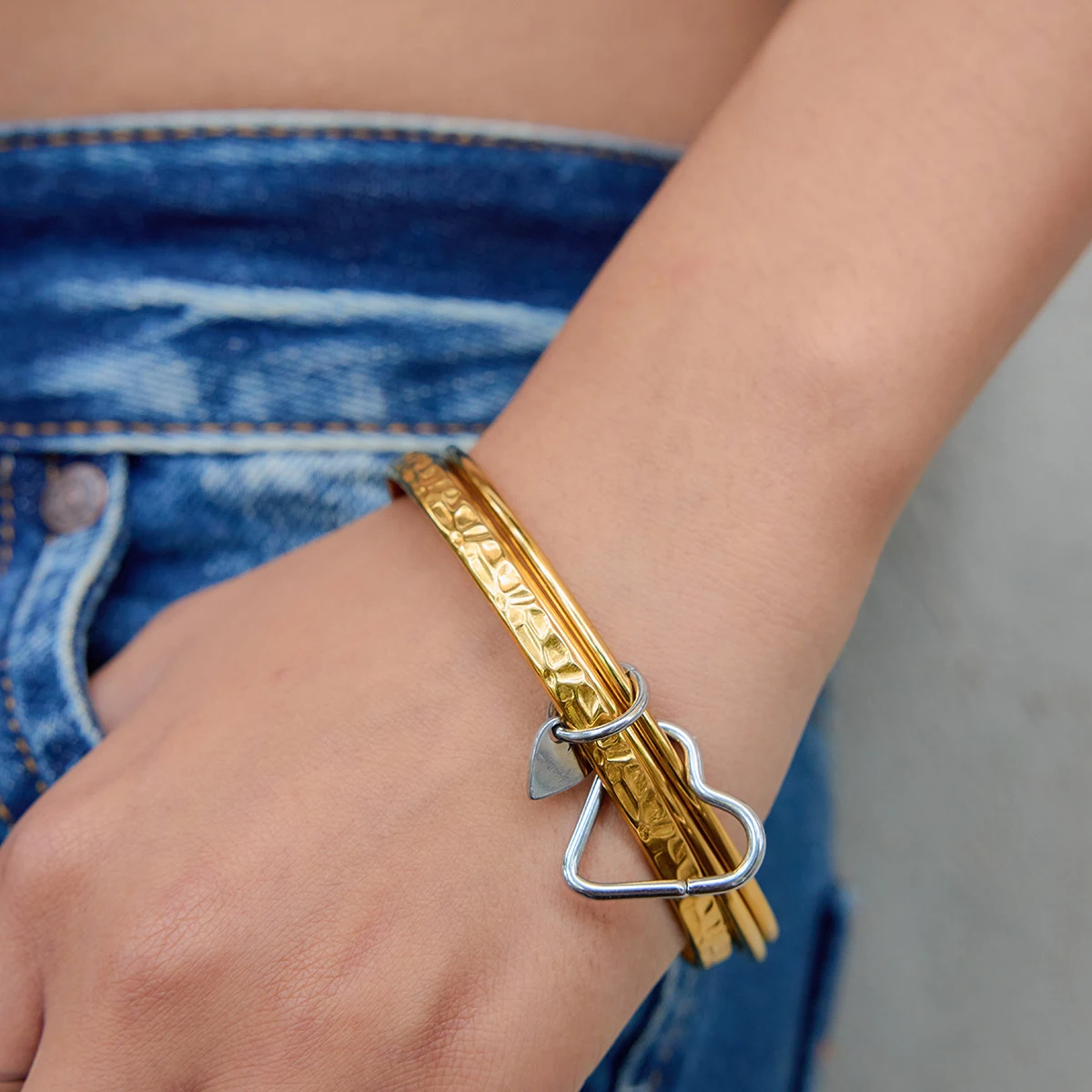 - Includes two gold-colored bangles with subtle textured details and one silver-tone bangle with a distinctive hollow heart-shaped pattern for a playful elegance.