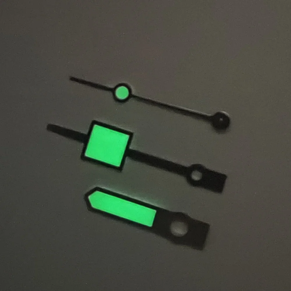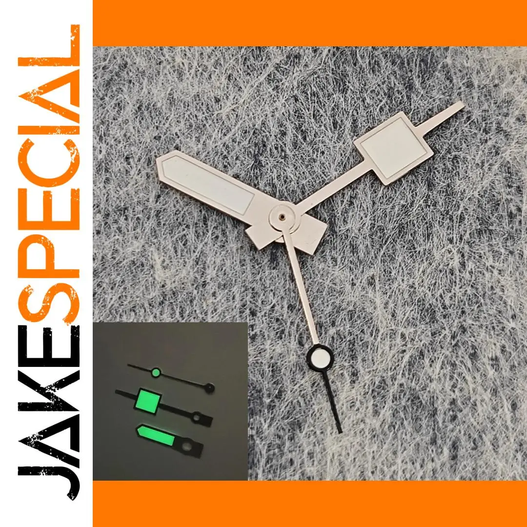 Enhance your watch with this set of stainless steel hands designed for NH35, NH36, 4R, and 7S movement watches. The bold, rectangular hour and minute hands feature green luminous coating for excellent visibility in low light, glowing vividly in the dark. The slender, black second hand includes a small luminous green circle near the tip and a white counterweight for striking contrast. Measuring 8 mm wide, 12 mm tall, and 12.5 mm in length from the center of the needle hole, these high-quality replacement hands are perfect for upgrading your timepiece’s appearance and functionality with a sleek, modern aesthetic.