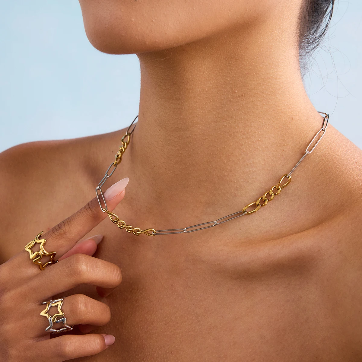 This stainless steel necklace features a sleek, modern design with elongated rectangular links forming a geometric paperclip style. Crafted with a durable, shiny gold finish, it offers both elegance and longevity. The adjustable classic link chain includes a secure clasp for a comfortable fit across various neck sizes, making it suitable for casual or formal occasions. Its polished surface with smooth edges highlights high craftsmanship quality, while its unisex style ensures versatile wear. Perfect for elevating everyday outfits or adding a sophisticated touch to special events, this necklace combines contemporary aesthetics with durable, safe materials for long-lasting enjoyment.