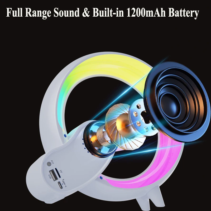 Experience modern elegance with this circular white Bluetooth speaker and alarm clock, measuring 210 mm in diameter, 65 mm in width, and weighing 520 grams. It features a sleek digital LED display showcasing time, date, and temperature, complemented by vibrant RGB LED mood lighting that cycles through colors or remains static. Enjoy high-quality sound with enhanced bass and crystal-clear calls via long-range Bluetooth connectivity. The device supports wireless charging with safety features like overcharge protection and automatic temperature regulation when used with a compatible 5V DC adapter (not included). Its contemporary design makes it perfect for enhancing the ambiance in bedrooms, offices, or lounge areas.