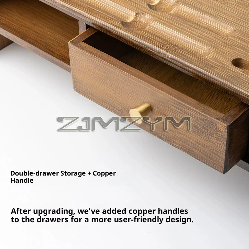 - Includes two side-by-side drawers with copper handles for organized storage of small accessories or documents.
