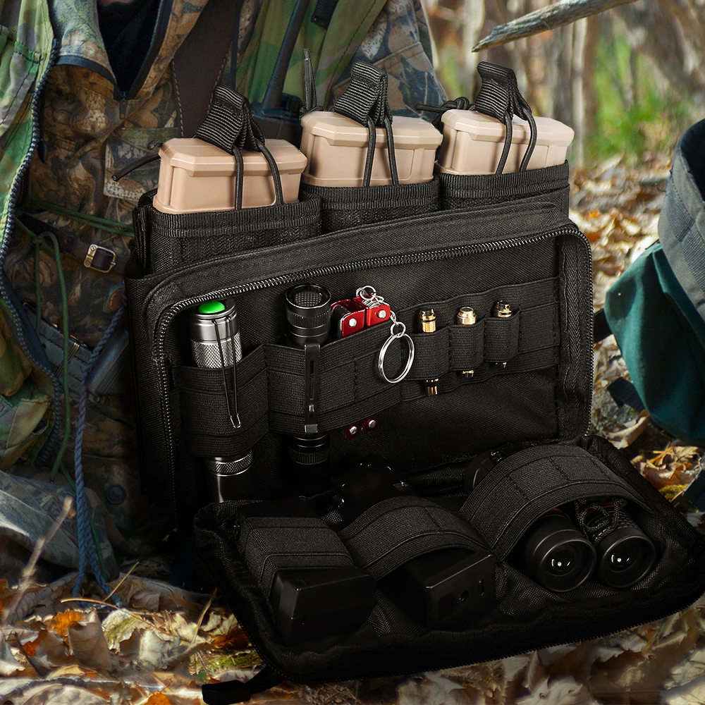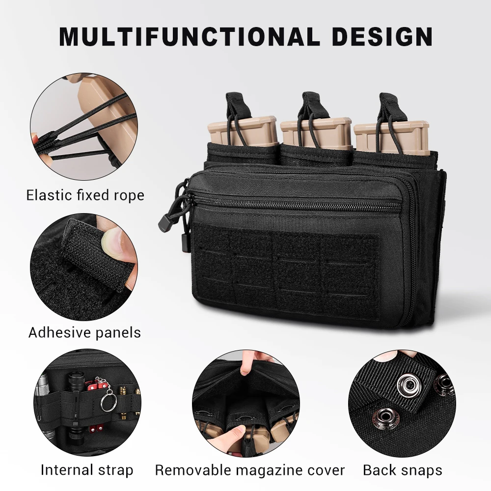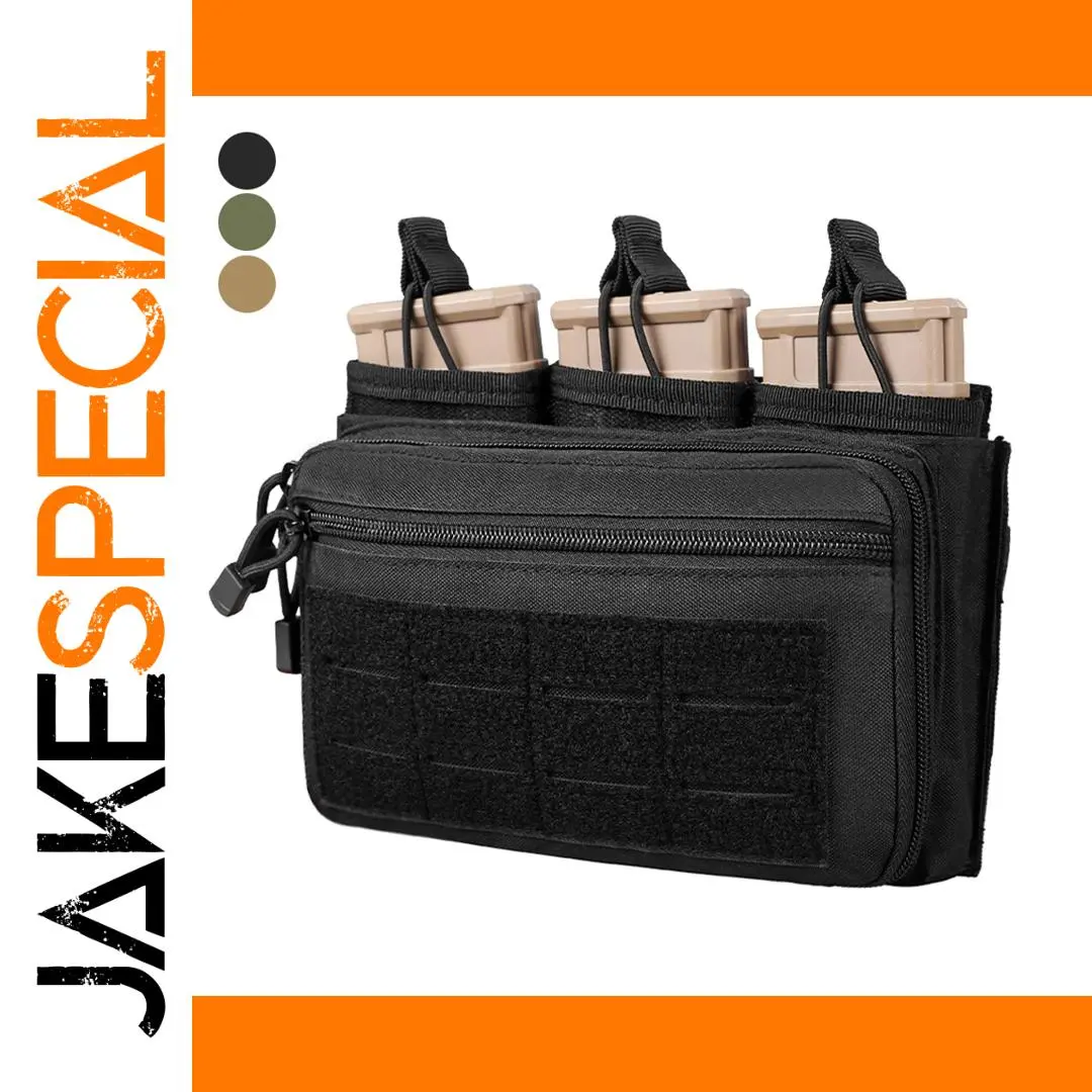 Experience ultimate versatility with this rugged Molle Triple Magazine Pouch, crafted from durable 1000D nylon fabric and weighing approximately 322 grams. Measuring 9.3″ in length, 2.4″ in width, and 5.6″ in height, it accommodates up to three magazines of 5.56mm or similar sizes, such as M4, M16, or AR models. Designed with an open top and adjustable bungee retention for secure fast access, it features a double zipper closure, laser-cut hook & loop molle panel on the front, and four reinforced molle straps on the back for attachment to gear or vests. An added two front zipper pockets contain elastic bands, making it perfect for admin, utility, or EDC use in tactical or outdoor scenarios. Available in black, green, and tan to suit your preferences.