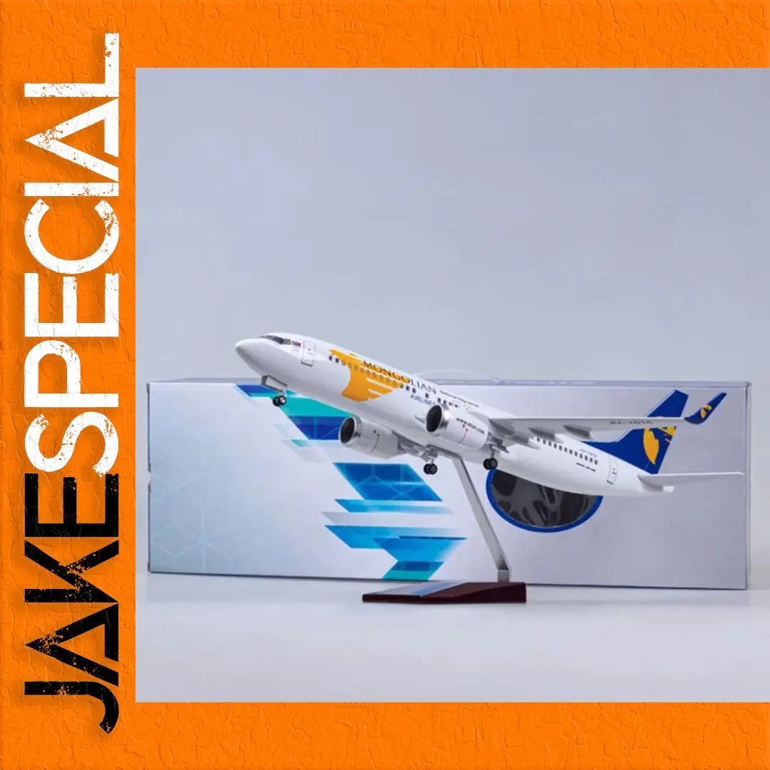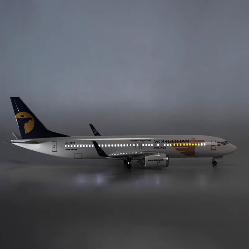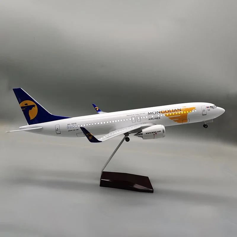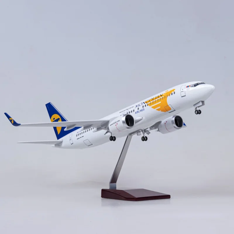 Experience the exquisite craftsmanship of this detailed Boeing 737-800 aircraft model, measuring approximately 47 centimeters in length. Crafted from resin and plastic, it features a glossy, smooth finish that highlights vibrant, accurate branding and markings of the Mongolian airline. The model's design showcases the iconic white fuselage, eye-catching yellow and black lettering, and a striking tail fin with a deep blue base complemented by yellow accents and a bold logo. Wings are slightly lifted, with carefully detailed engines and landing gear, adding a sense of dynamic realism. The removable wings and wheels allow for secure transportation, and the voice-activated cabin light enhances its interactive appeal. An ideal display piece for aviation enthusiasts.