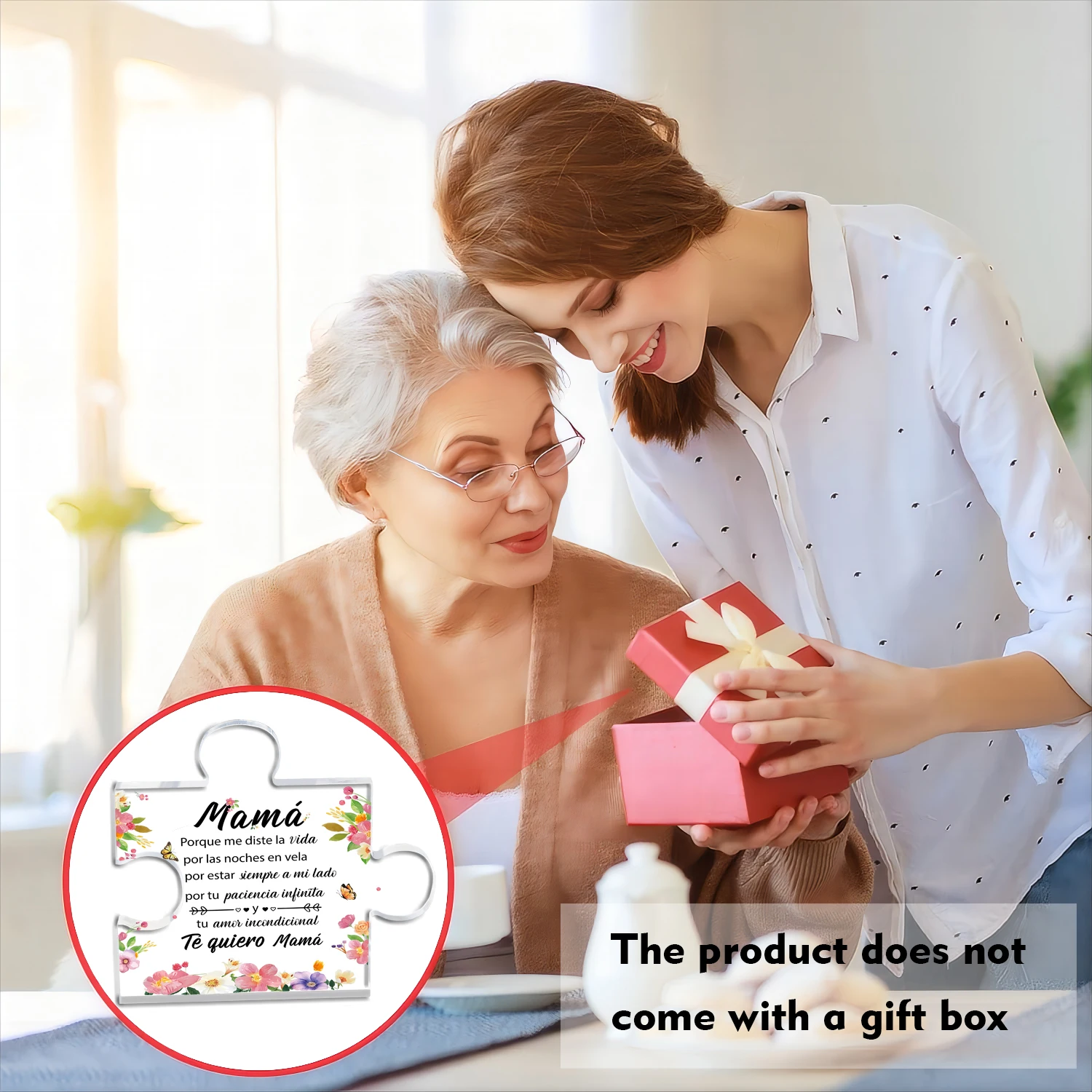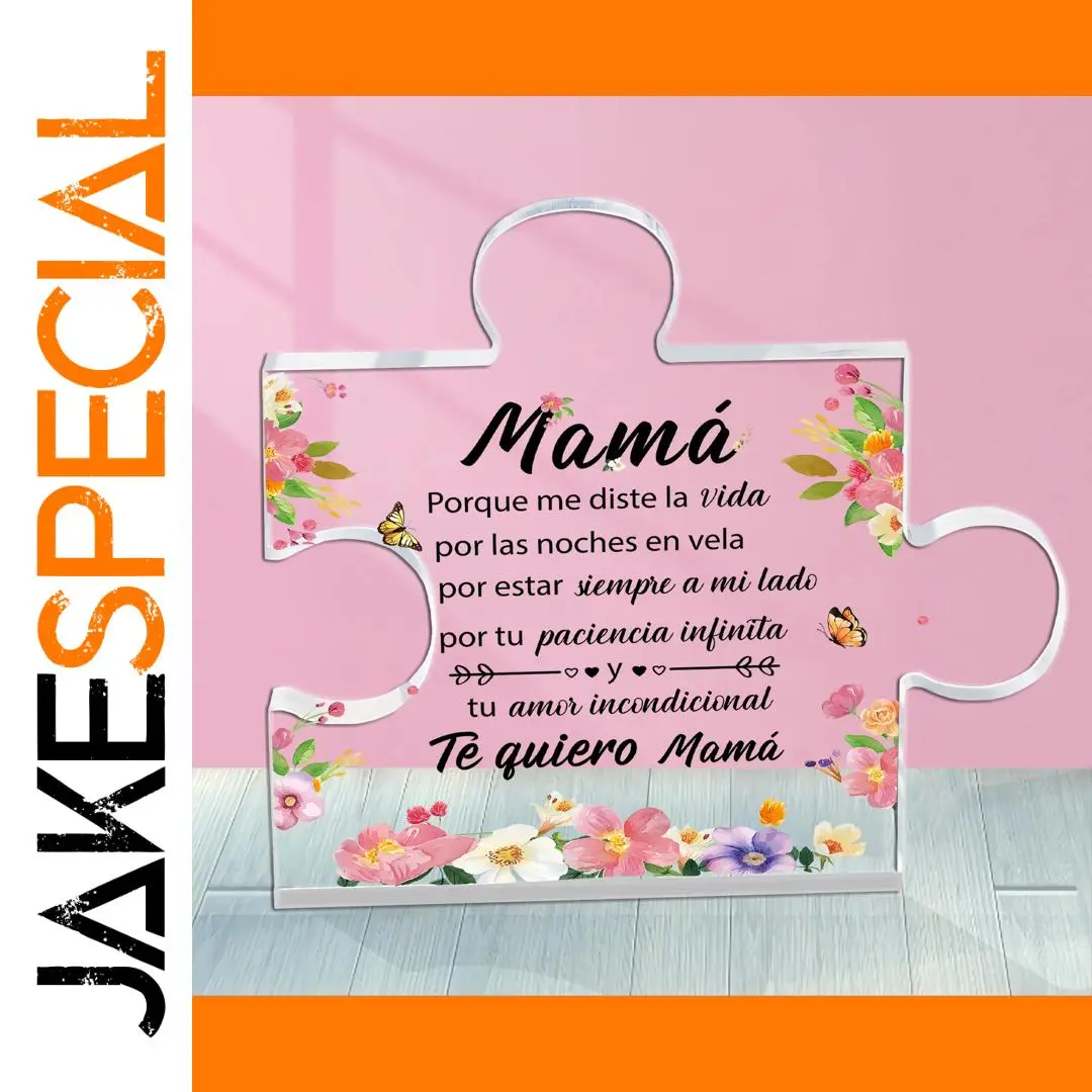 Imagine adding a heartfelt touch to your mom’s workspace or home with this beautifully crafted acrylic puzzle piece. Its glossy, semi-transparent surface catches the light beautifully, highlighting the vibrant floral illustrations in pink, purple, orange, yellow, and green hues. The soft pink background, complemented by whimsical butterflies, creates a joyful and tender ambiance. The bold, black cursive “Mamá” at the top instantly conveys love and appreciation. Beneath it, a heartfelt message in delicate script expresses gratitude and devotion. With its classic puzzle shape and polished finish, this keepsake becomes a meaningful gift that she will cherish daily—perfect for celebrating her special day and showing your love.