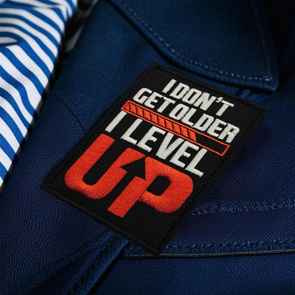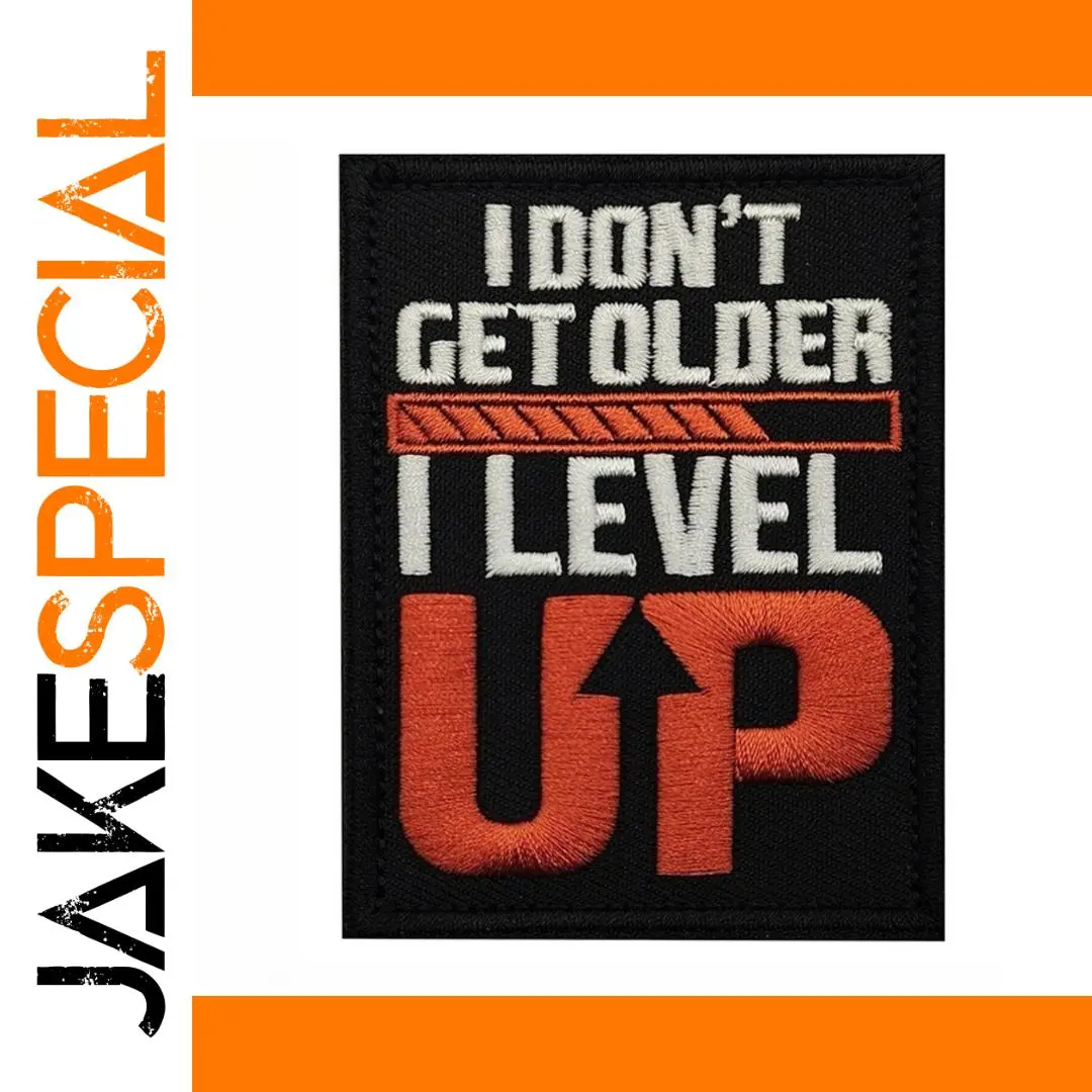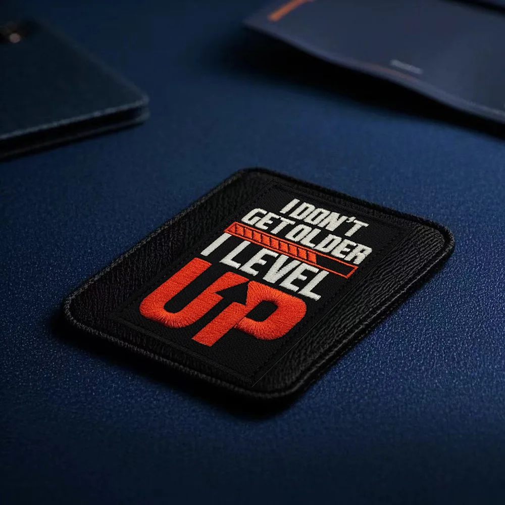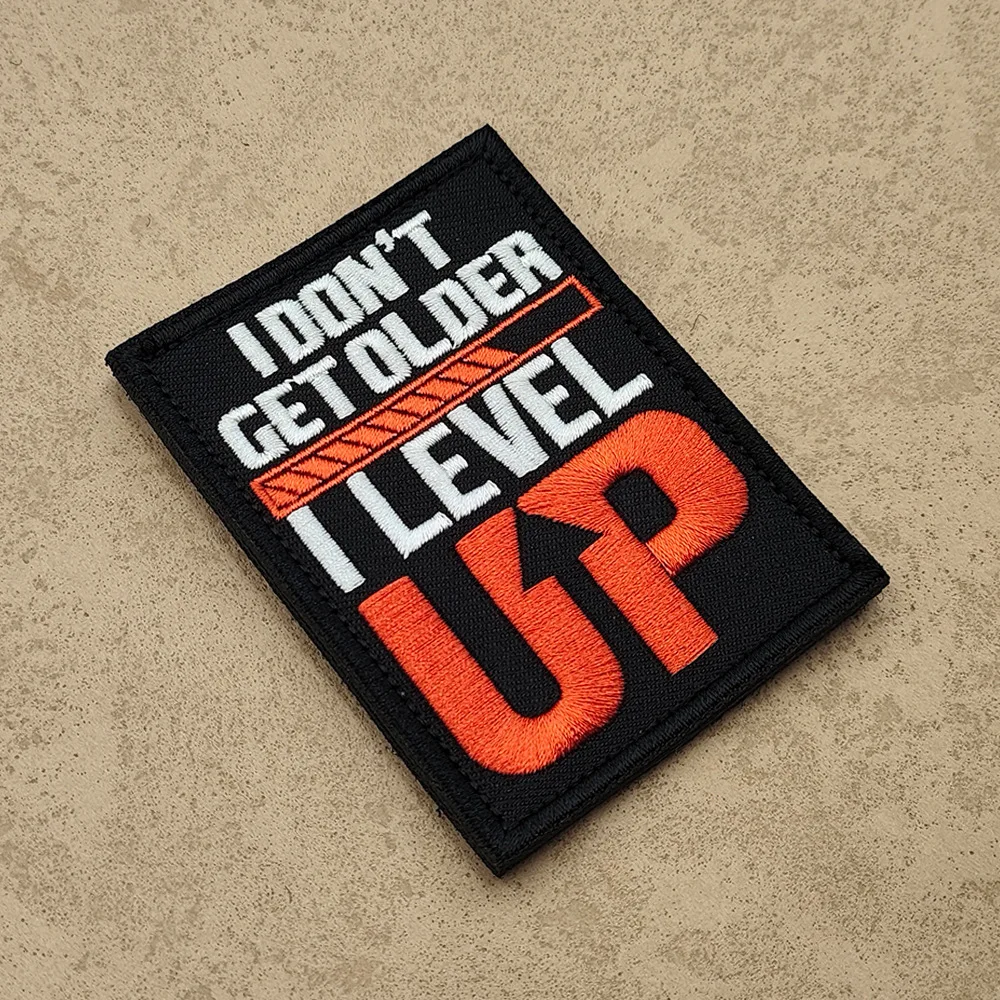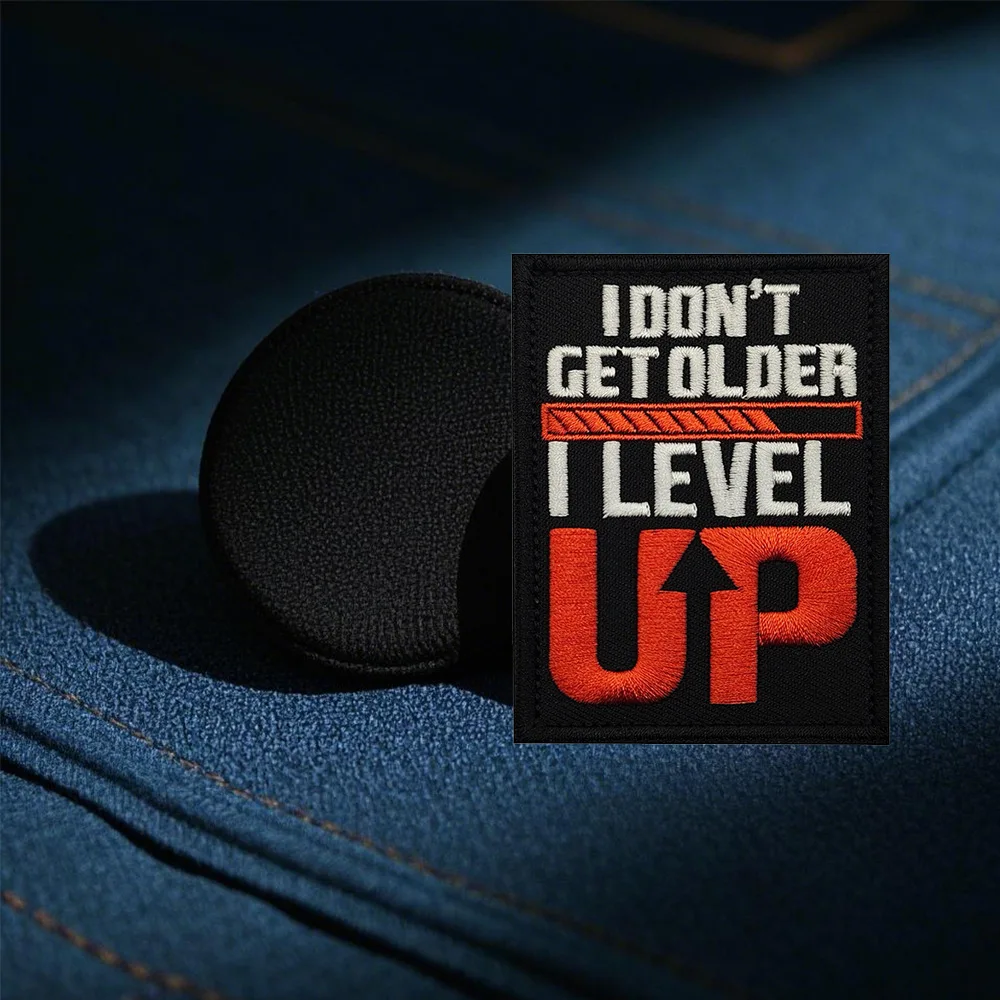 Enhance your gear with this bold embroidered patch featuring an inspiring message. Crafted from durable nylon and polyester, its black background provides a striking contrast for the vibrant white and bright orange embroidery. The design showcases the phrase “I DON'T GET OLDER, I LEVEL UP,” with “UP” prominently highlighted in bold orange, including an upward arrow. A decorative orange stripe with diagonal lines underscores the message, adding a modern, energetic touch. The neatly stitched edges give it a clean, finished look and a subtle raised texture, ensuring durability for daily use. Perfect for jackets, backpacks, hats, or DIY projects, this patch blends motivation with style, making your accessories stand out with confidence.