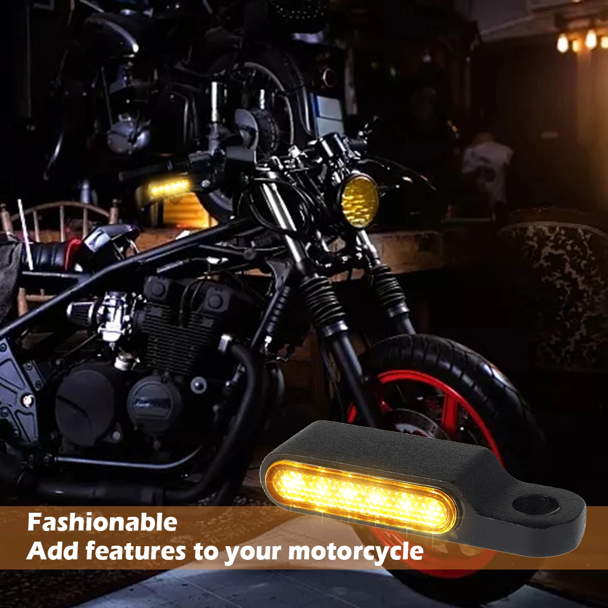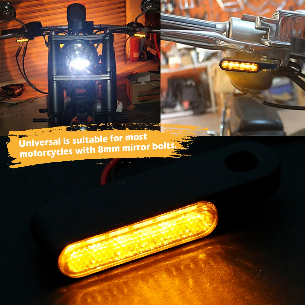 Enhance your motorcycle’s visibility and style with these sleek 2-piece LED handlebar turn signals, measuring approximately 5.5 x 1.5 cm and designed for 12V systems. Crafted with a durable smoked polycarbonate lens and available in black or silver, they feature built-in six LEDs that provide 180° visibility with bright amber front lights and white running lights. Waterproof and scratch-resistant, the signals are compatible with motorcycles using 8mm mirror bolts, including models like Sportster, Dyna, Iron 883, Fat Bob, Softail, Touring, Shadow Grom, Suzuki Boulevard, Triumph Bonneville, and Thunderbird. Easy to install with corrosion-resistant black anodized metal brackets, they combine modern style with reliable performance for adult motorcycle enthusiasts.