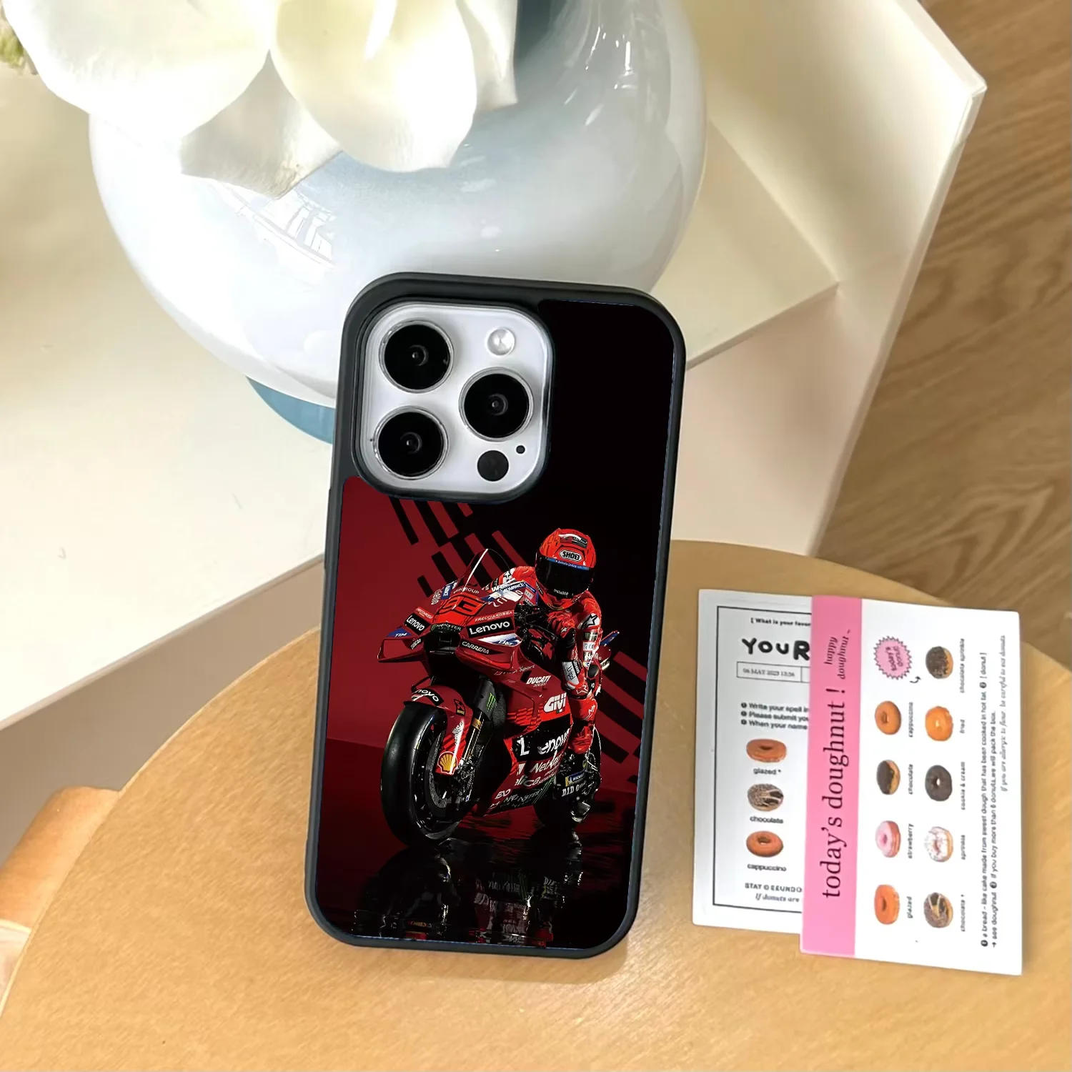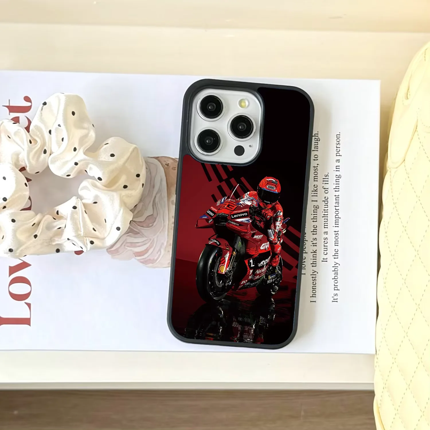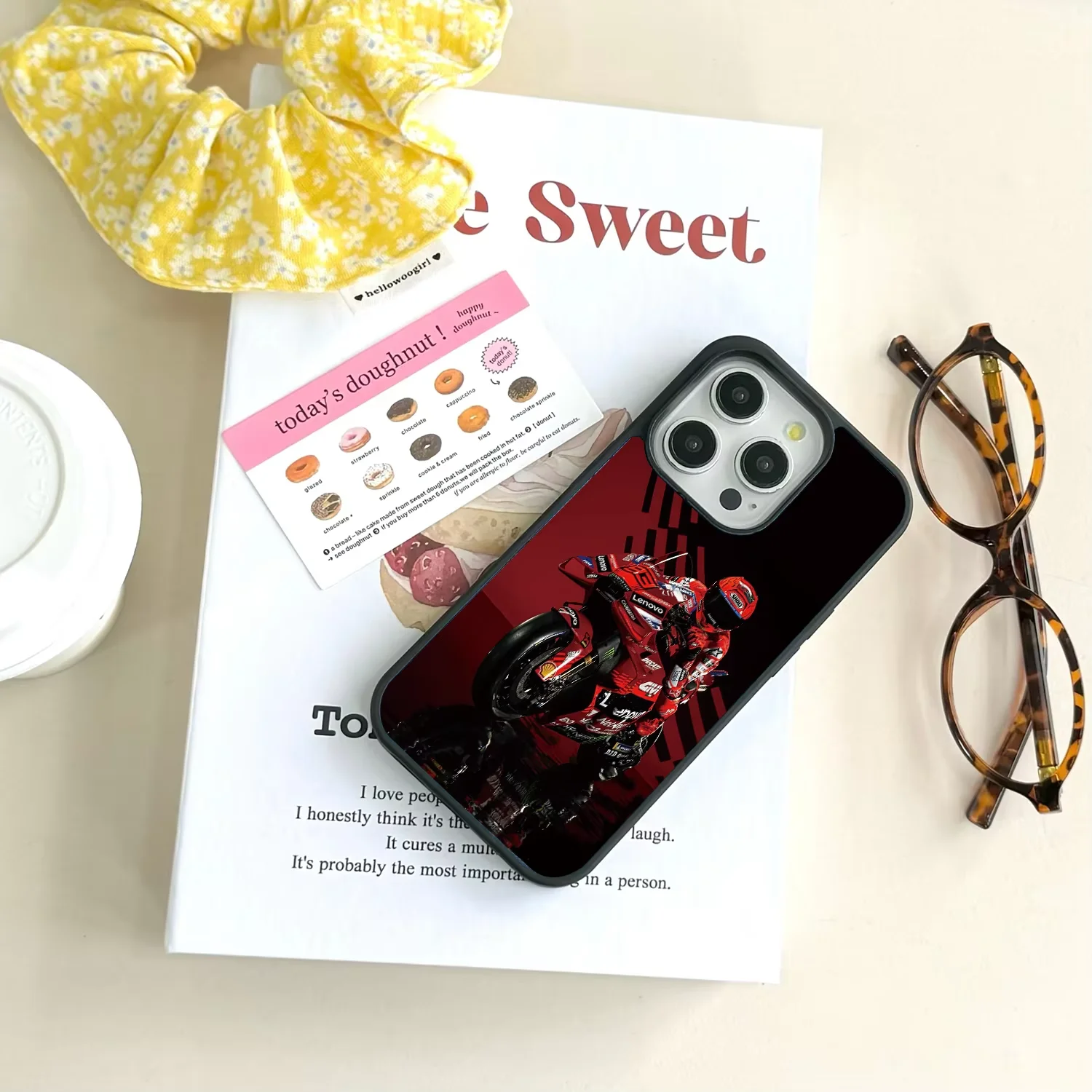 Immerse yourself in the thrill of racing with this motorcycle race-replica pattern phone case designed for a wide range of iPhone models. The vivid, high-energy design showcases a detailed illustration of a rider in bold red and black gear, gripping a sleek racing motorcycle in mid-action. The sleek black background, combined with dynamic diagonal lines, evokes a sense of speed and performance. Made from soft, flexible silicone, this case offers excellent durability, shock absorption, and a comfortable grip, with an anti-scratch and non-slip surface. Its semi-transparent glossy finish enhances the intricate artwork, ensuring your phone stands out. Perfect for motorcycle enthusiasts and lovers of adrenaline, this case blends protection with sporty style effortlessly.