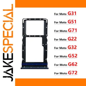 This durable black plastic SIM card and SD card tray holder and adapter is compatible with Motorola models G31, G41, G51, G22, G32, G52, G62, G72, and G71. Its sleek, minimalist design features precise cutouts with a rectangular compartment for a SIM card and an elongated section for an SD card, ensuring an exact fit within your device. Small holes around the perimeter provide secure attachment, while a contrasting blue strip adds a subtle pop of color for easy identification. Available in multiple colors including blue, green, light blue, silver, and dark blue, this replacement tray offers a reliable, functional upgrade to keep your Motorola smartphone operating seamlessly.