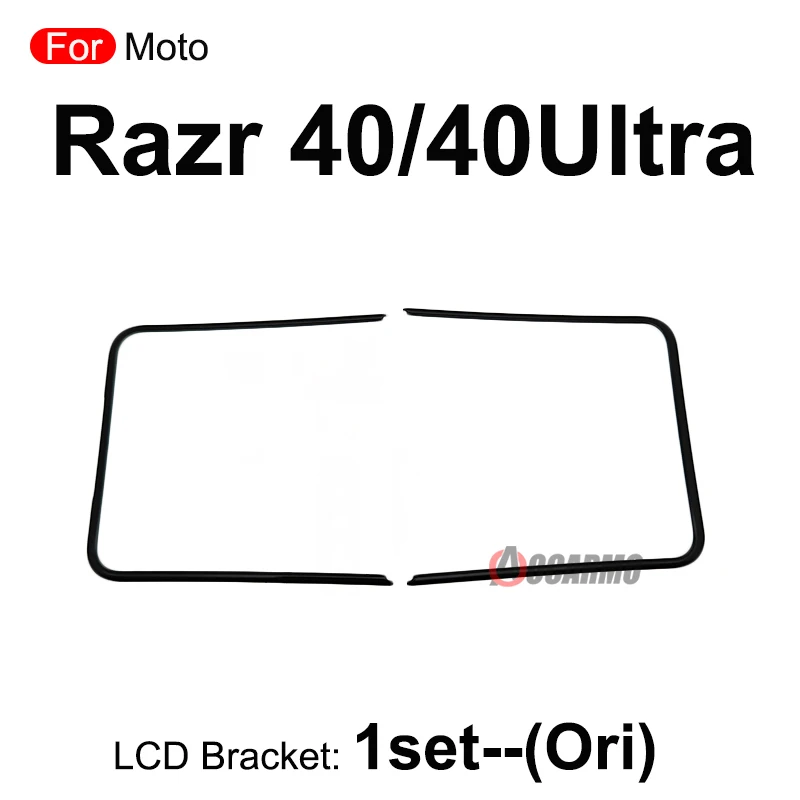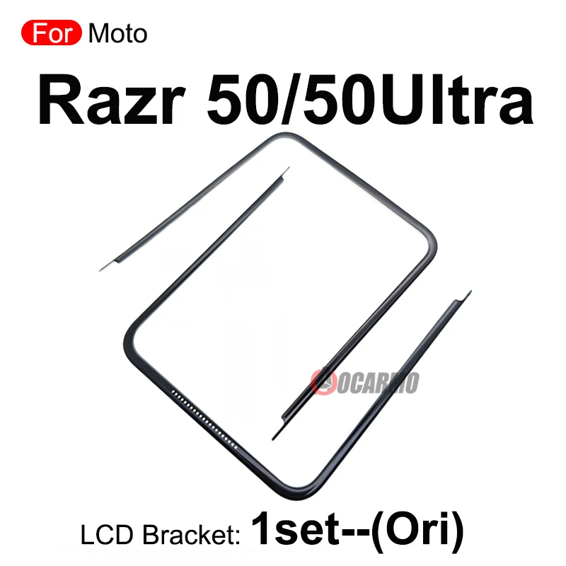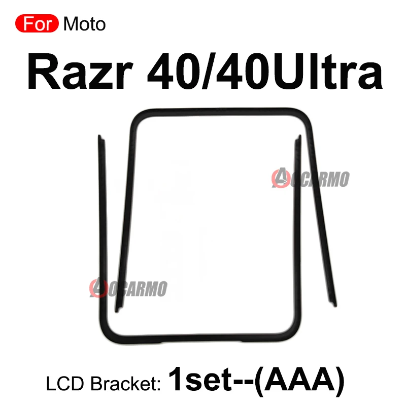 Enhance your Motorola Razr series with this durable replacement front screen stand, middle bezel frame, LCD display bracket, and plastic holder. Designed for models Razr 40 (40 Ultra), Razr 40 (40U)—AAA, and Razr 50 (50 Ultra), this set features a sleek black plastic construction with a matte or semi-matte finish that minimizes glare. The precisely molded rectangular frame with rounded corners and smooth edges ensure a seamless fit, with small cutouts for easy access to speakers, microphones, or charging ports. Ideal for repairs and assembly, these high-quality components offer a reliable, precise fit, aiding in restoring your device’s display integrity.