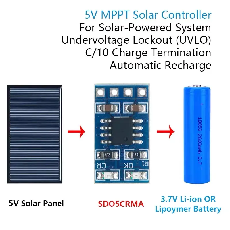 - Supports input voltage from 4.4 to 6V DC, ideal for small solar panel systems, ensuring versatile compatibility and maximum energy harvest for 3.7V and 4.2V batteries.
