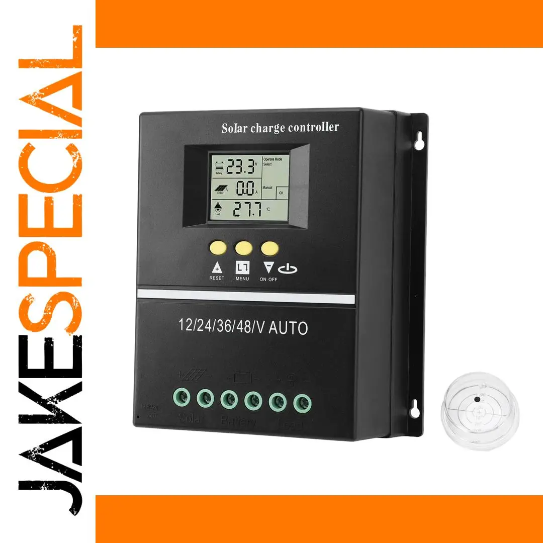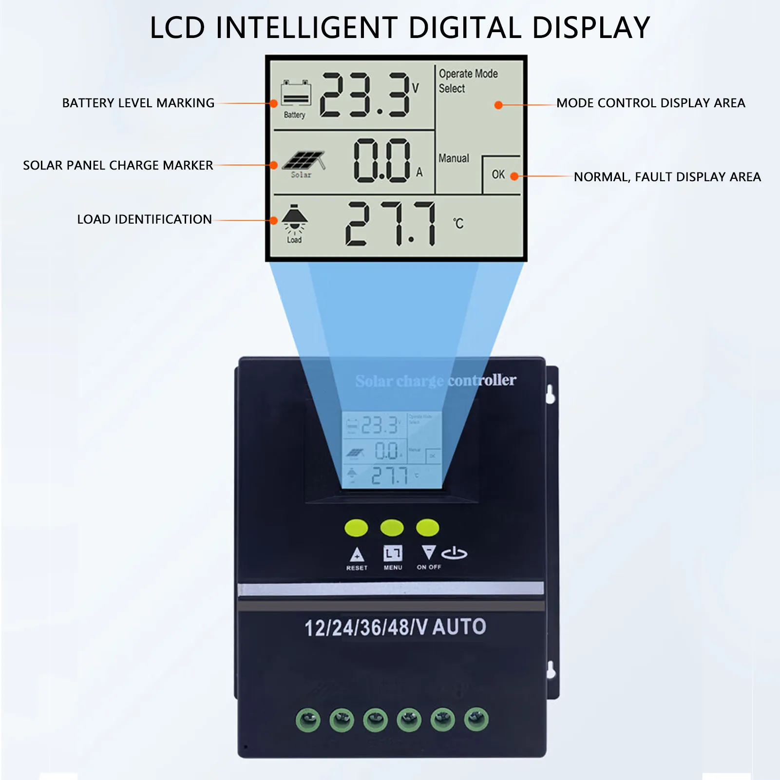 - Features a dynamic LCD display showing operating mode, battery voltage, charging/discharging currents, temperature, and troubleshooting icons.