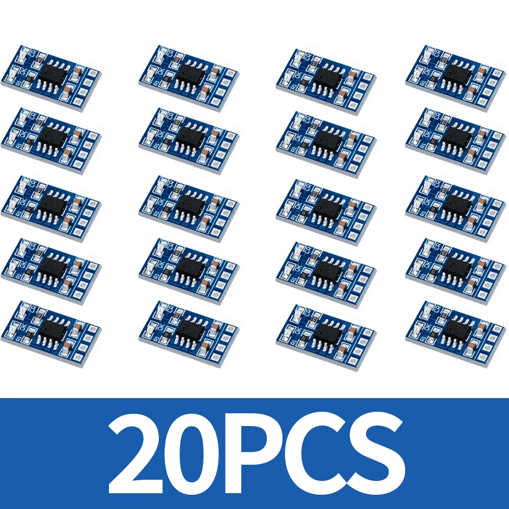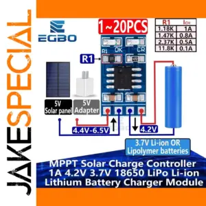 Experience efficient solar energy management with this sleek, blue PCB MPPT solar charge controller. Designed for charging 18650 LiPo and Li-ion batteries, it features a compact rectangular form with a high-tech aesthetic. The organized surface showcases surface-mount components, metallic solder pads, and a prominent black IC chip, emphasizing precision engineering. The color-coded wiring—red for positive and blue for negative—makes connections intuitive and straightforward. Supporting 1 to 20 units, with a current of 1A and operating at 4.2V or 3.7V, this module is versatile for various applications. Its simple yet professional design ensures durability, ease of installation, and optimal power flow, making it a reliable choice for DIY projects, renewable energy systems, or battery management solutions.