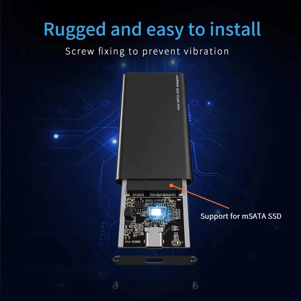 Experience the perfect blend of style and performance with this sleek mSATA to USB 3.1 SSD enclosure. Designed to provide fast, reliable data transfer, this enclosure supports drives up to 4TB and features a lightweight, slim profile that fits effortlessly into your daily tech setup. Its aluminum alloy chassis ensures durability, shock resistance, and excellent heat dissipation, keeping your SSD cool during intensive data transfers. Whether you choose the classic black, sophisticated grey, or vibrant blue, this enclosure adds a modern touch to your portable storage solutions. Easy to install with included screws and screwdriver, it connects via USB Type-C, making it compatible with all your latest devices. Perfect for professionals and enthusiasts seeking efficiency and elegance in one compact package.