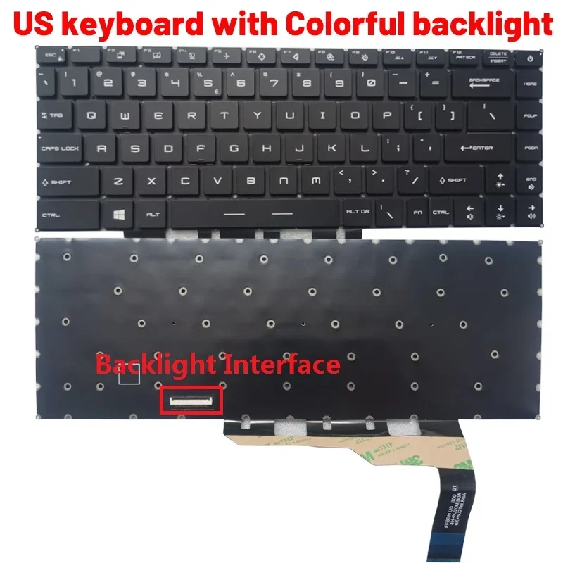 Enhance your MSI laptop experience with this new US laptop keyboard, compatible with models including Summit E15 A11SCST, E15 A11SCS, MS-16S6, E14 A11SCS, GS66, MS-16V1, MS-16V3, GP66, MS-1542, and GE66. Featuring a sleek black design and a US standard layout, the keyboard boasts matte-finished keys for improved tactile feedback. Keys are labeled with clear light grey characters, and backlighting options in colorful and white add a modern touch. Enjoy peace of mind with a 180-day warranty and prompt shipping within 24 hours after verification of your order.