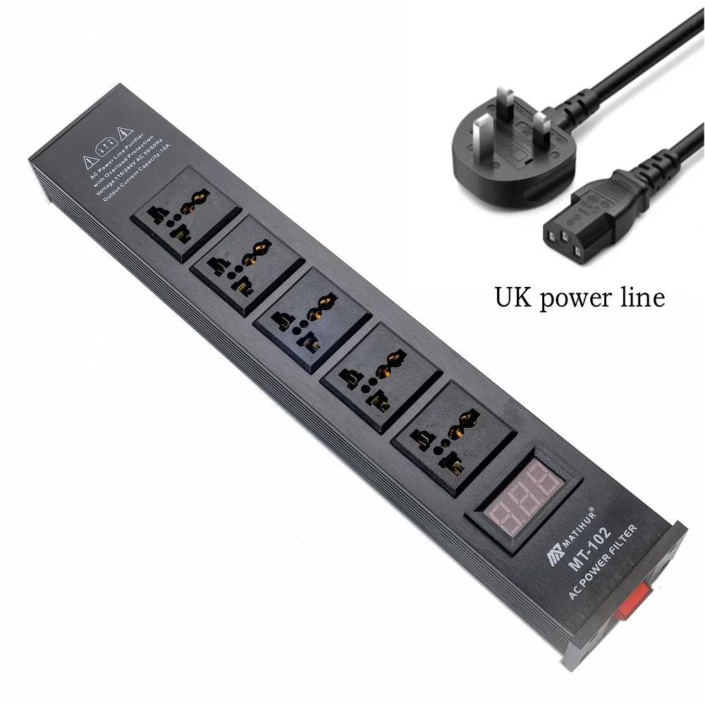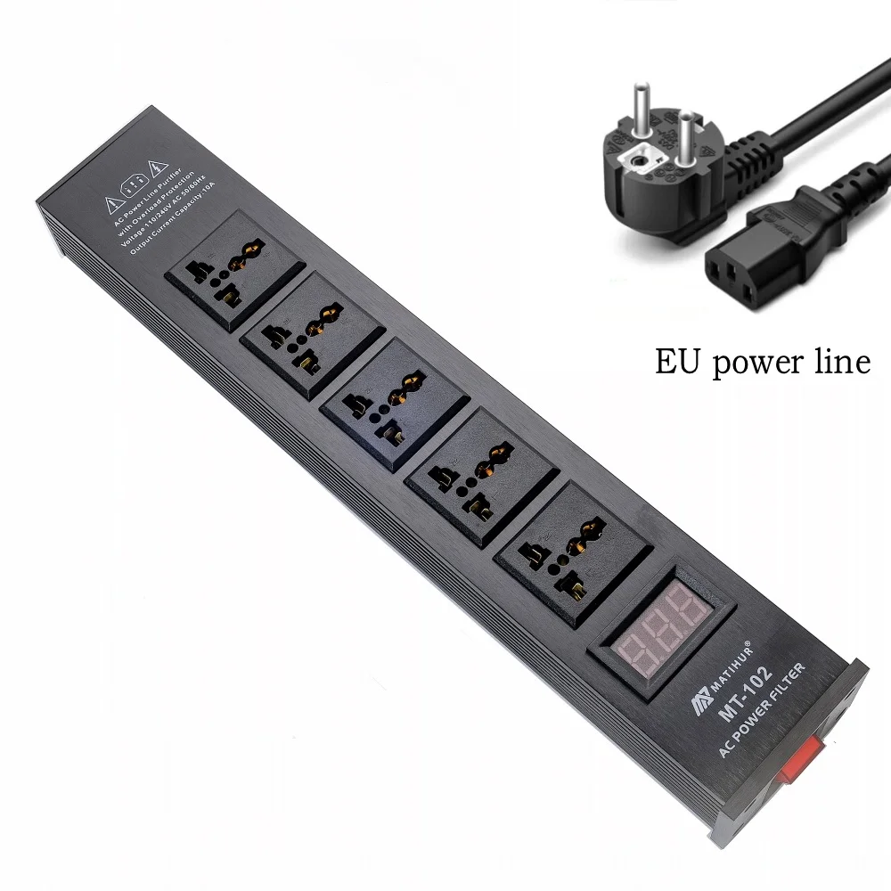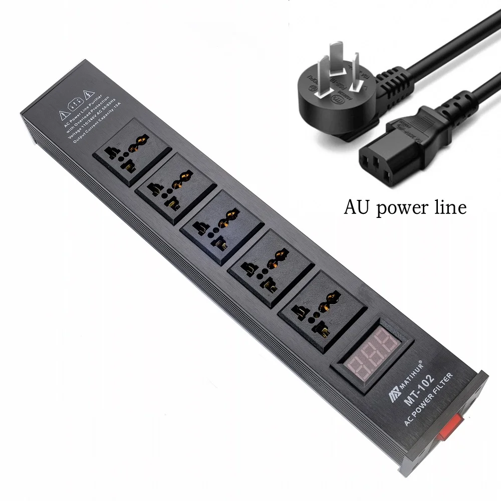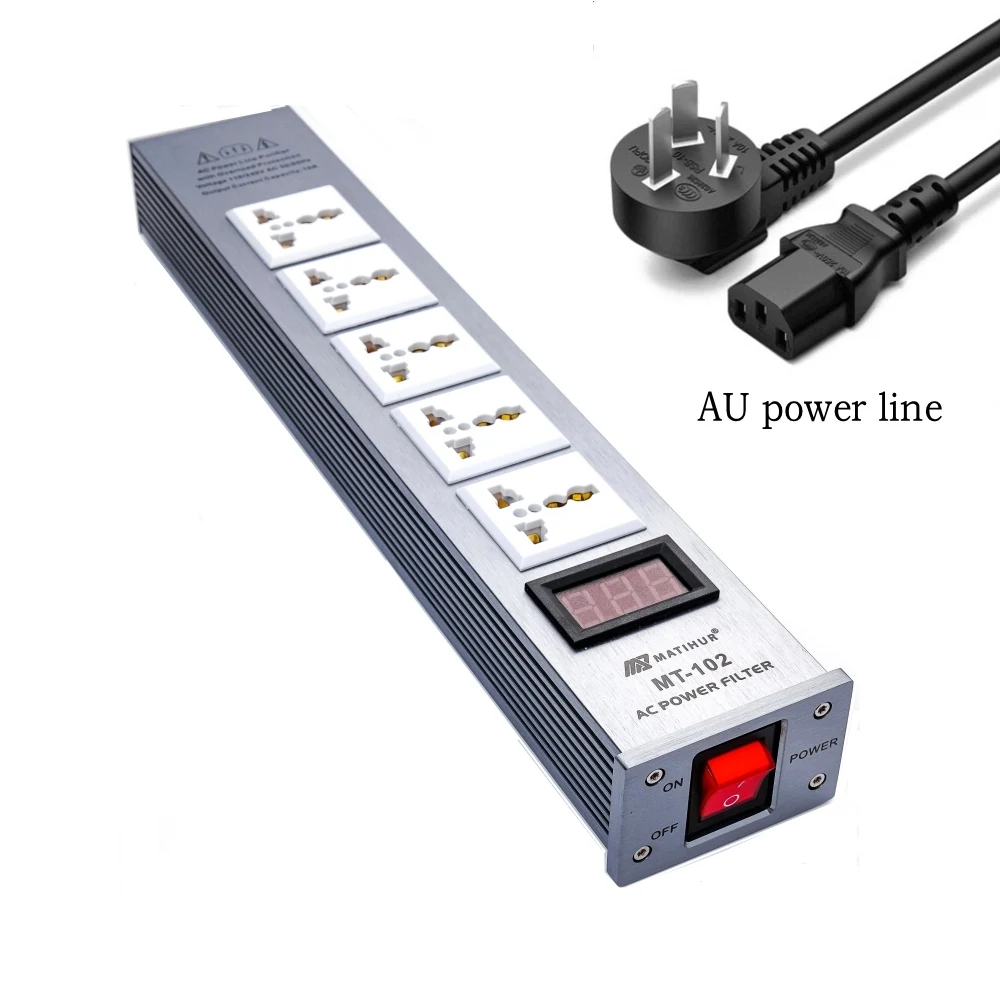 Experience the ultimate in audio clarity with this this MT-102 Power Filter. Designed to deliver pure, noise-free power, it ensures your HiFi systems, large TVs, projectors, and theater equipment perform at their best. Its sleek rectangular metallic housing features a durable aluminum case with ribbed sides for heat dissipation and durability. The unit measures approximately 380mm in length, 72mm in width, and 45mm in height, weighing around 1230 grams. Equipped with five universal sockets—EU, UK, US, AU standards—each with anti-jamming and surge protection, it provides safe and reliable power for multiple devices. The digital display indicates operational status, and the prominent red master switch offers convenient control. Its high-quality components promote stable performance and sound quality, making it an essential addition for audiophiles and home theater enthusiasts.