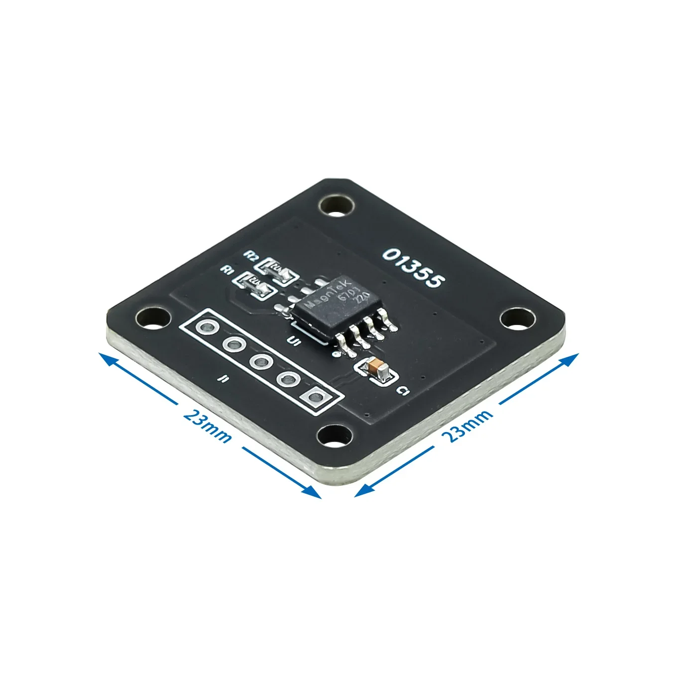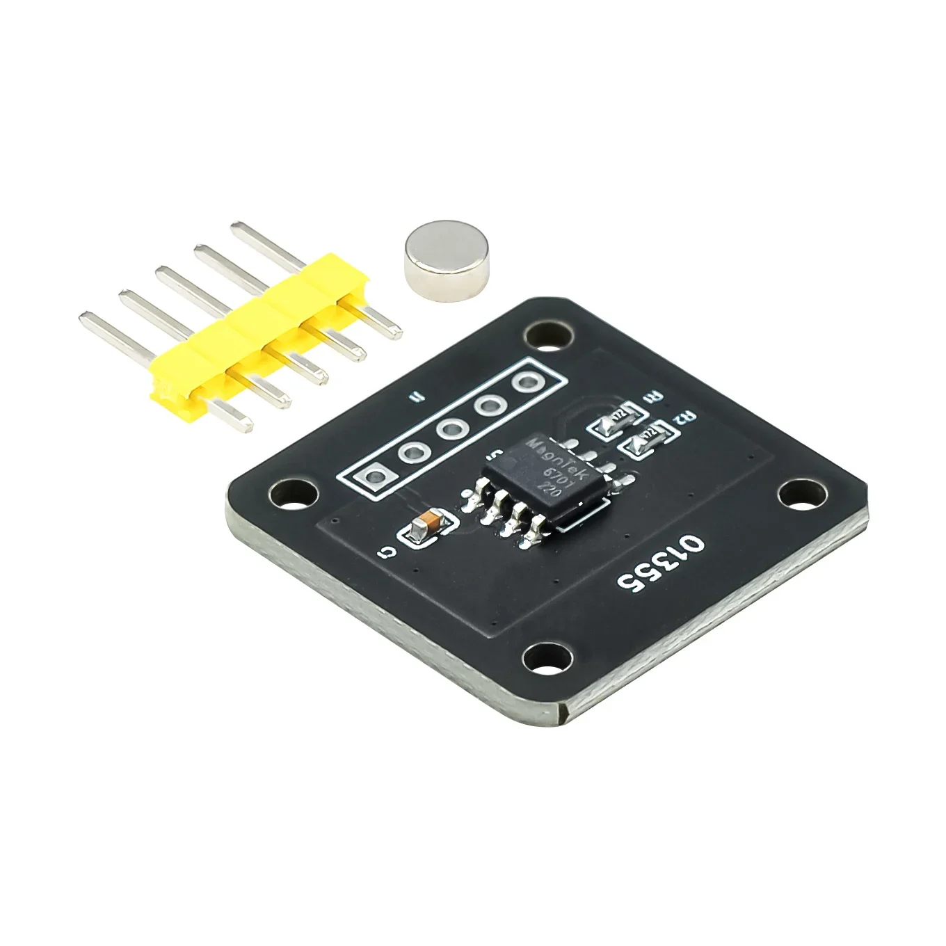 The MT6701 is a high-precision magnetic angle measurement sensor module featuring differential Hall induction technology, capable of measuring absolute angles from 0° to 360°. Operating with a voltage of 3.3V to 5.0V and temperature tolerance from -40°C to 125°C, it boasts a linearity deviation of less than ±1° (up to ±1.5° across temperature). With a system delay of just 5 microseconds, it supports rotation speeds up to 55,000 RPM. The module provides 14-bit digital angle data via I2C and SSI interfaces, with flexible incremental outputs (ABZ, UVW) supporting resolutions from 1 to 1024 lines, alongside 12-bit PWM and analog outputs. Ideal for precise angular measurement applications.