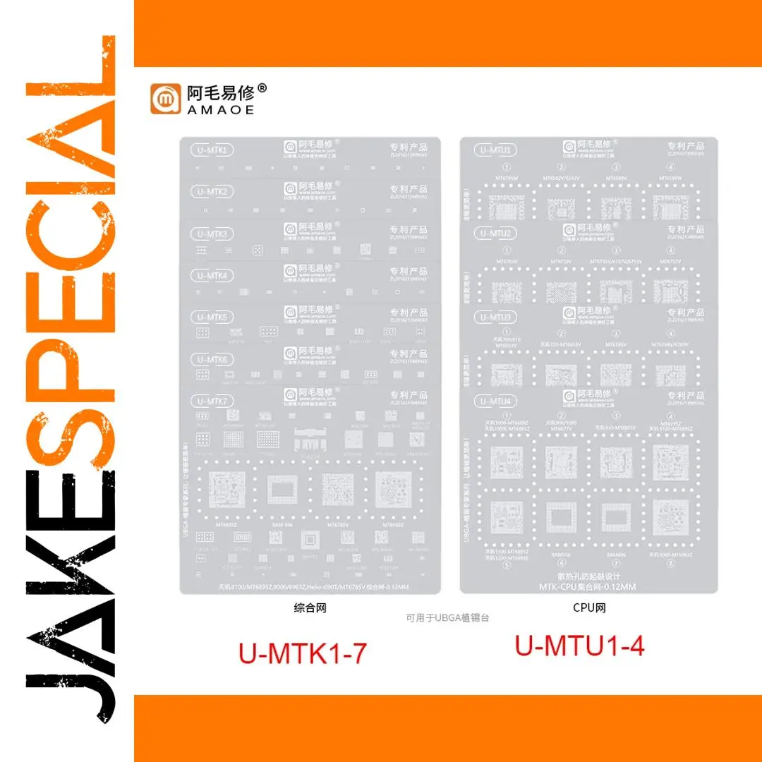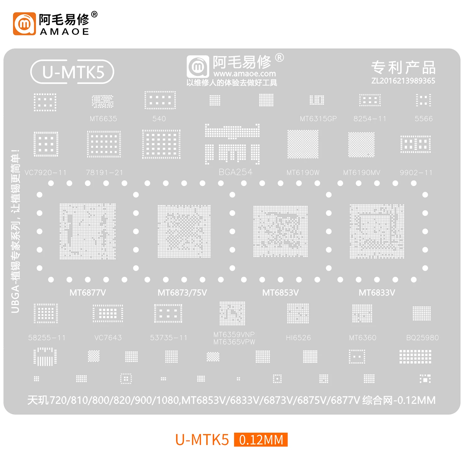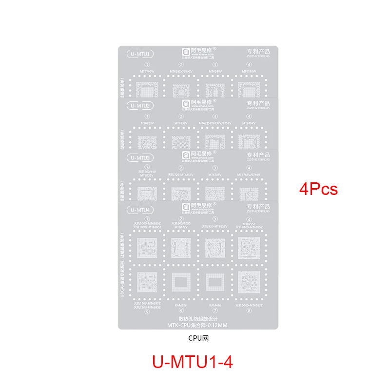 Enhance your electronic repair toolkit with this precision BGA reballing stencil, designed specifically for MTK CPU models including MT6833V, MT6877V, MT6799W, MT6833, MT6853V, MT6873V, MT6875V, MT6785V, MT6769V, MT6779V, and MT6771V. Crafted with a 0.12mm thickness, it features an organized grid layout with detailed patterns, dotted outlines, and tiny holes to ensure accurate solder ball placement. The stencil is available in multiple color-coded variations such as U-MTK1 to U-MTK7 and U-MTU1 to U-MTU4, including multi-piece sets for versatile applications. Its professional-grade design supports DIY electronics repairs and is compatible with various model configurations.