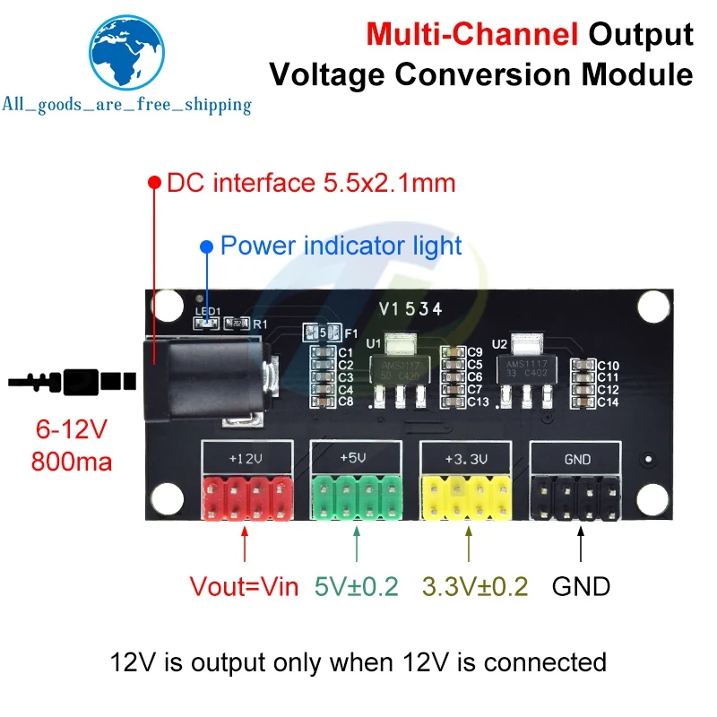 - The module accepts a 12V input and outputs selectable voltages of 3.3V, 5V, and 12V, ideal for diverse electronic projects that require precise voltage regulation.