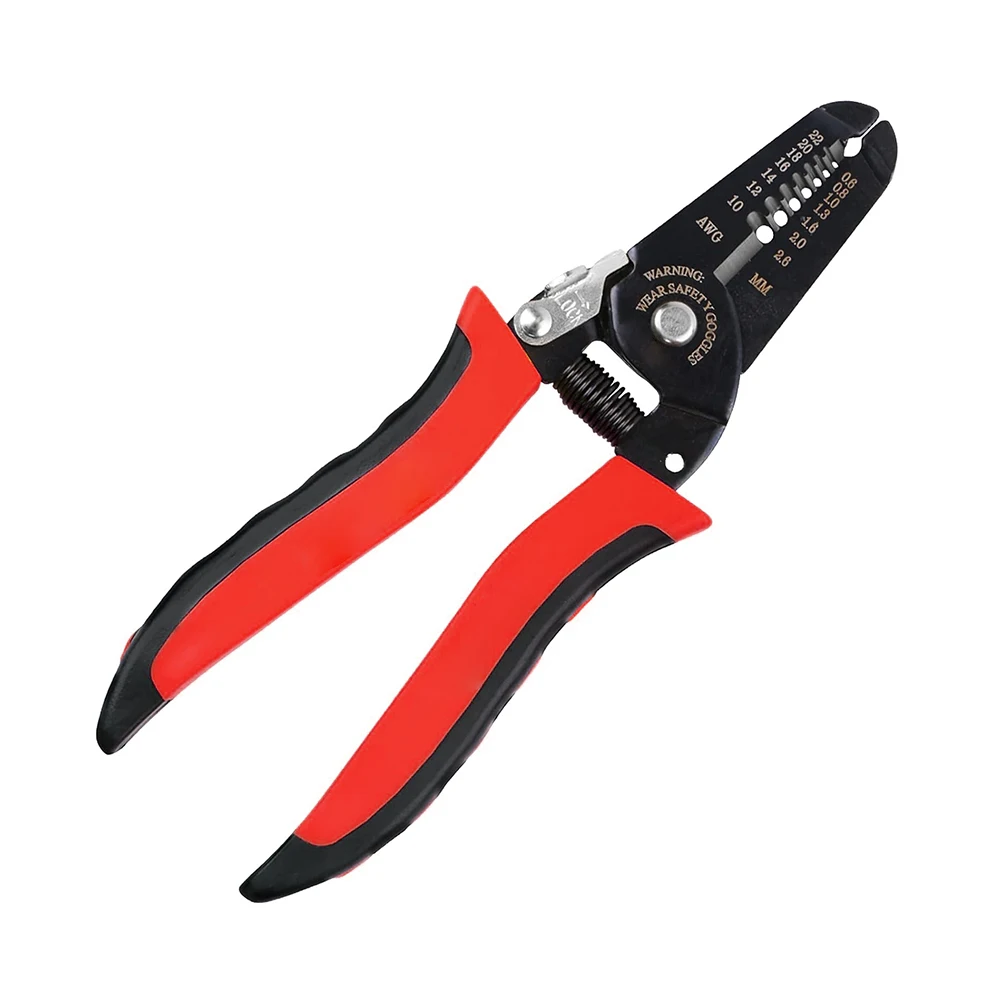 Experience precise and versatile electrical work with this multi-functional wire cutter, stripper, and crimper, featuring a sleek black and blue design. Equipped with ergonomic, non-slip handles in red and black for comfortable gripping, it includes a safety lock and coil spring for enhanced safety and ease of use. Crafted for durability and efficiency, this versatile tool handles wire sizes from 10 to 22 AWG (0.6 to 2.6 mm), with clearly printed wire gauge and stripping range charts on the side for quick reference. Designed for professional or DIY electrical tasks, it combines functionality, safety, and a modern aesthetic to elevate your wiring projects.