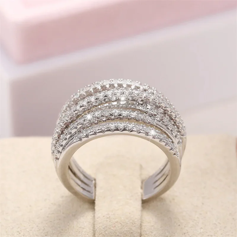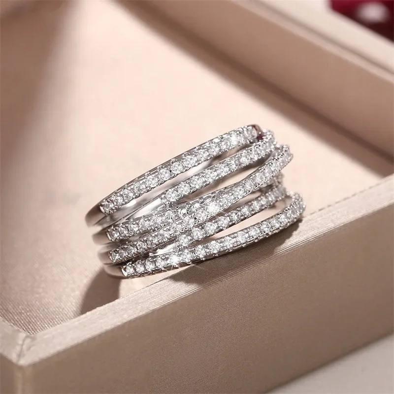 - This versatile women's ring showcases a stylish cross-shaped design, featuring four layered, slightly curved bands decorated with tiny zircon stones for outstanding brilliance.
