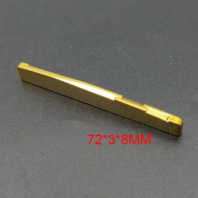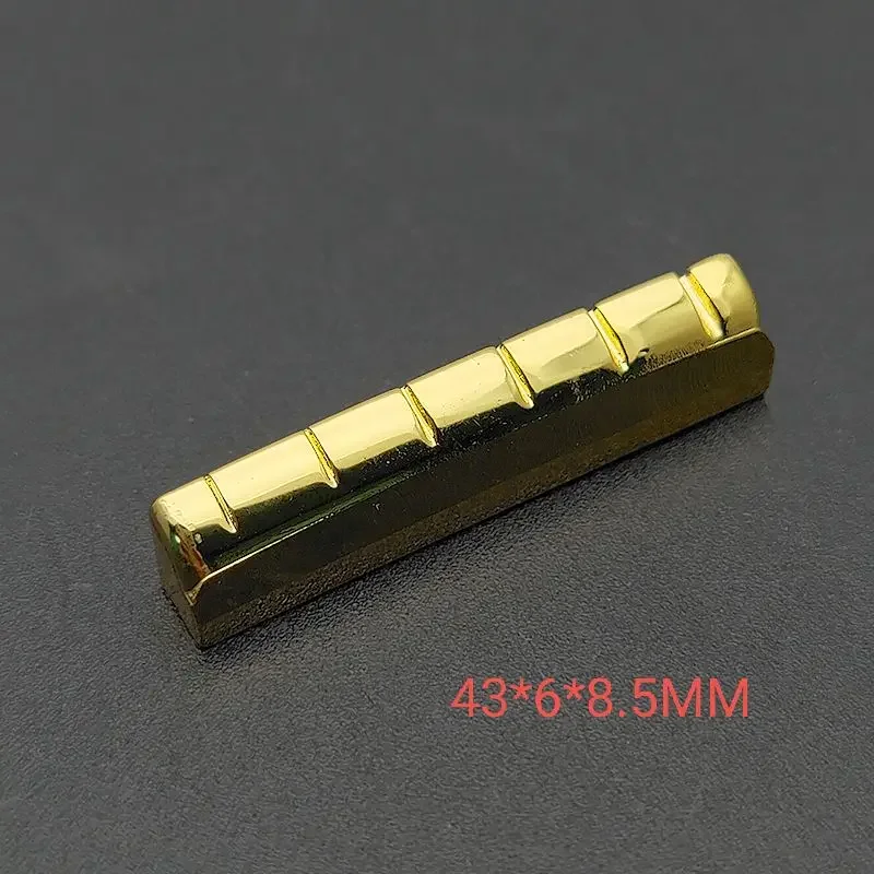 Elevate your guitar-playing experience with this exquisite multi-size brass nut and saddle, ideal for electric guitar, acoustic guitar, and bass guitar. Featuring a shiny, gold-plated finish, this accessory not only enhances the aesthetics of your instrument but also contributes to superior sound quality. The solid brass construction ensures durability while the meticulously designed grooves provide precise string placement. Available in various sizes to cater to your specific guitar needs, each unit promises a perfect fit and exceptional performance. Picture yourself improving your sound and style with this essential upgrade.