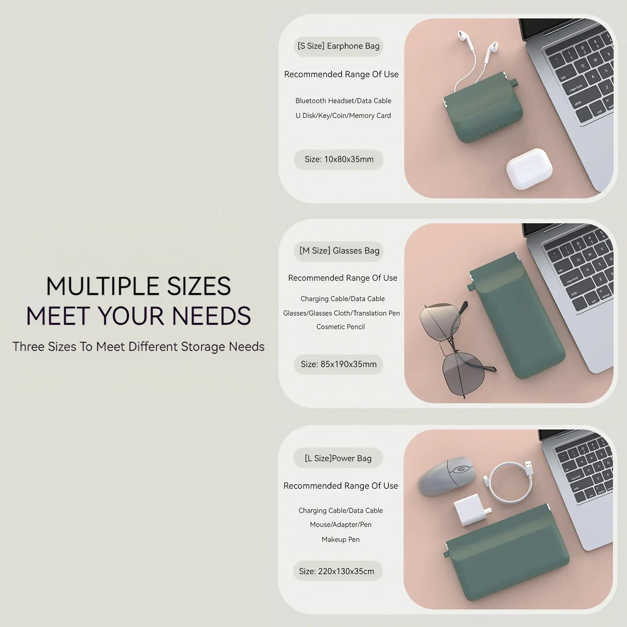 - Technical specifications include high-quality silicone material, dimensions as specified per size, and compatibility with a wide range of personal objects like cables, keys, cosmetics, and electronic accessories.